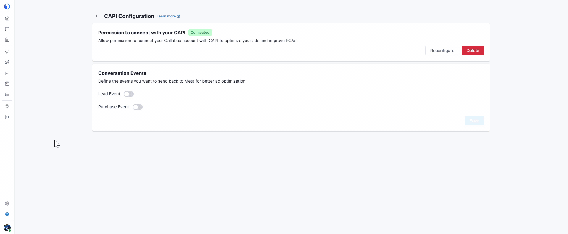 <figure><img src="https://3137140735-files.gitbook.io/~/files/v0/b/gitbook-x-prod.appspot.com/o/spaces%2FZcl3T6ePz95GpzjAeOLW%2Fuploads%2FJhvNEPkh3xf9tZPzSlrw%2FCAPI%20Configuration%20page.gif?alt=media&#x26;token=e1c79fb1-de1a-451c-a5b5-52ea1fbf855a" alt=""><figcaption></figcaption></figure>
