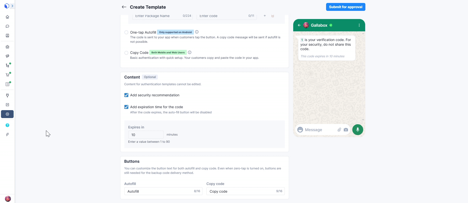 Authentication templates include optional add-ons like security disclaimers and expiry warnings. In addition, authentication templates must have a one-time password button (copy code or one-tap). The presets in the authentication message template fixed text are: