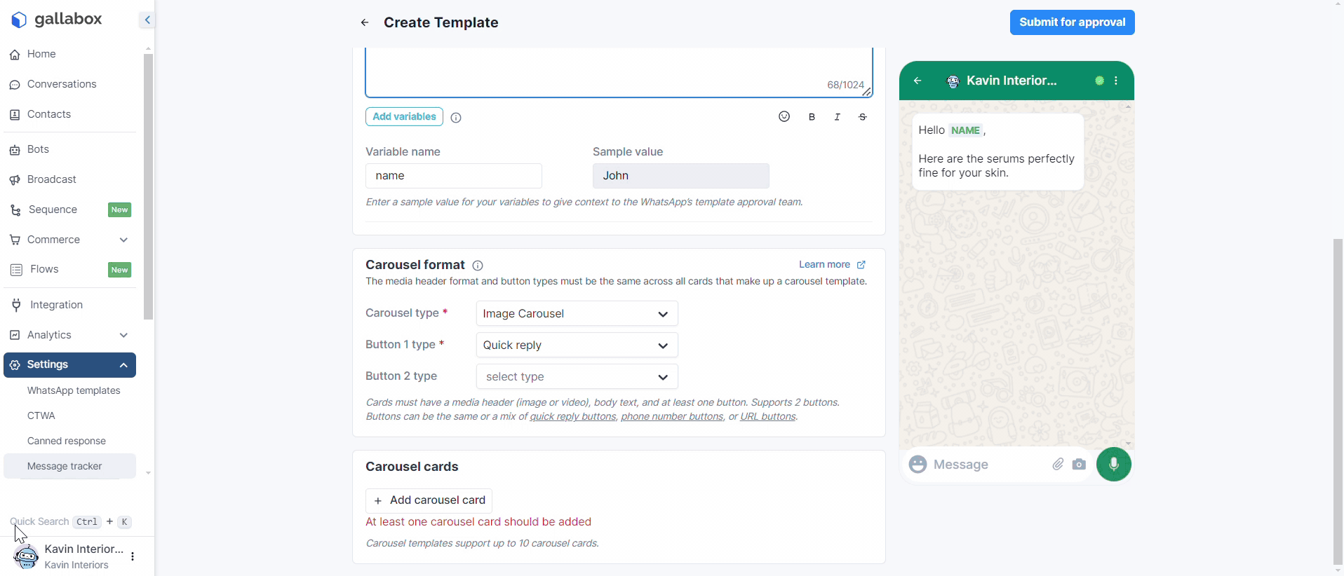 After selecting the Carousel format and carousel cards, submit the Template to META for approval.&#x20;
