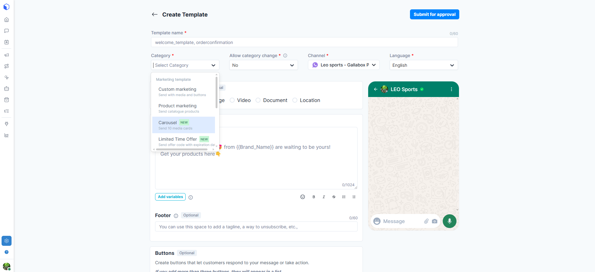To create a Carousel Template, you have to select the Carousel Template under Category.