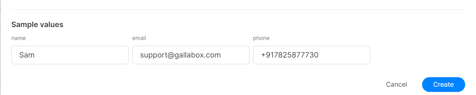A sample variable has to be given at the time of creating your template message. Variables can be off: name, email, phone number, date, media files, order number, payment status, URL, etc.