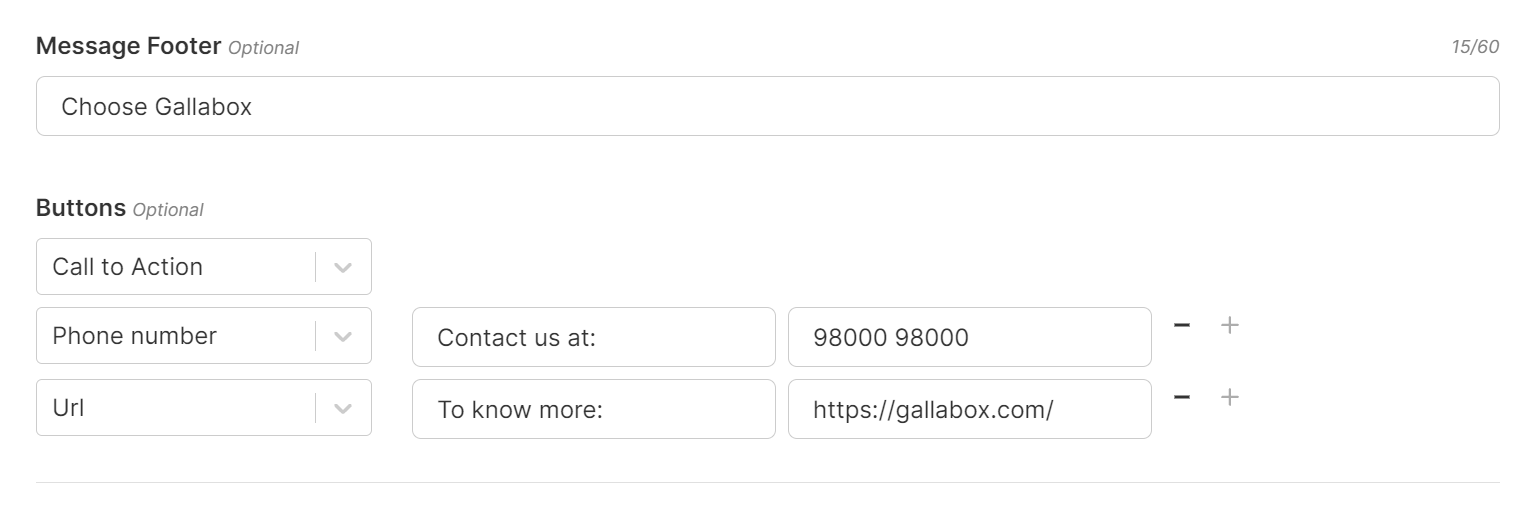 The URL cannot be in a shortened format or have more than one variable. CTA buttons cannot be of two phone numbers or two URLs.​![](https://2022268617-files.gitbook.io/~/files/v0/b/gitbook-x-prod.appspot.com/o/spaces%2FZcl3T6ePz95GpzjAeOLW%2Fuploads%2Fo5hMbJfRu7Z490FzABbe%2FCTA%20error1.PNG?alt=media\&token=7c9275d6-188c-4719-b550-6890cebc8891)​