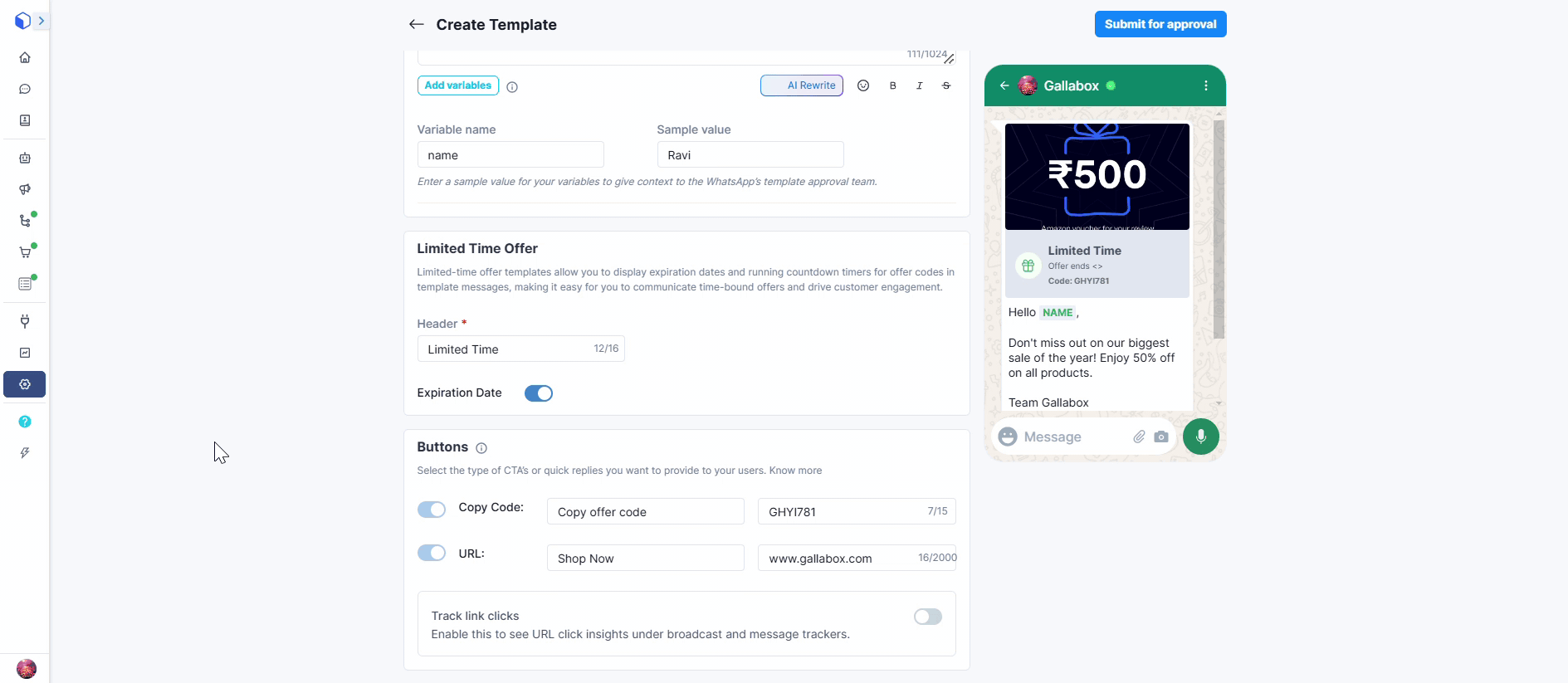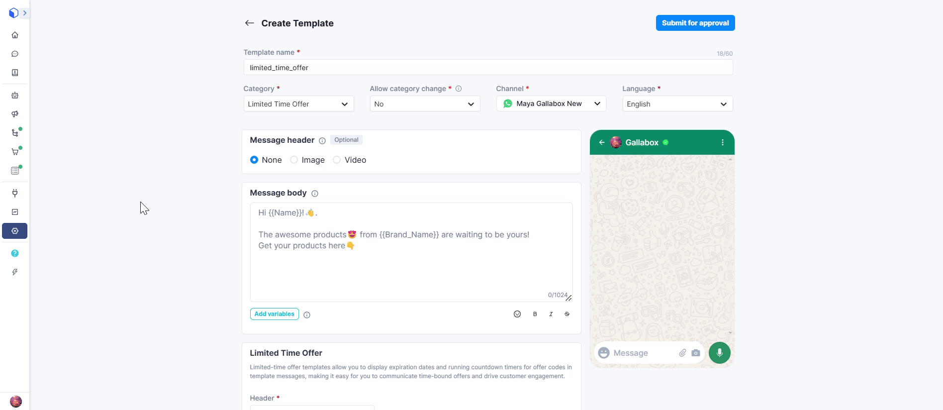 2. Provide the WhatsApp template name, choose the category as "Limited Time Offer", allow category change as "No", choose the WhatsApp Channel in Gallabox, and choose the language in which you want to send the WhatsApp Template.