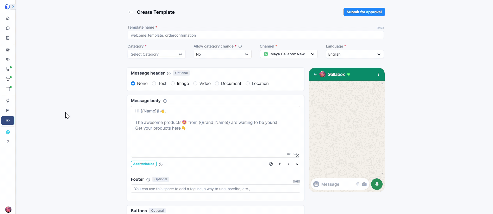 3. Choose the header, mention the message you want to convey in Message Boday section, provide sample for the variables defined, and provide the content for footer (optional).&#x20;