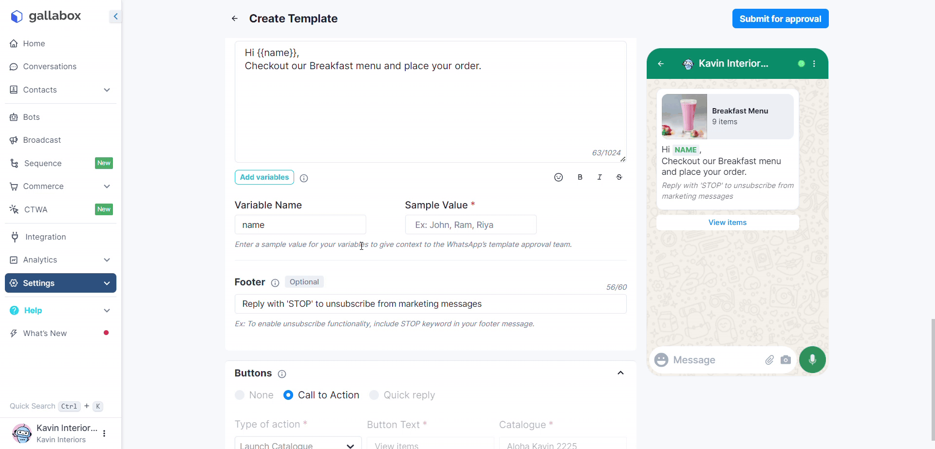 * **Product Inventory**: Ensure your product details are uploaded to Meta in an e-commerce catalog, and connect it to your Gallabox Account.