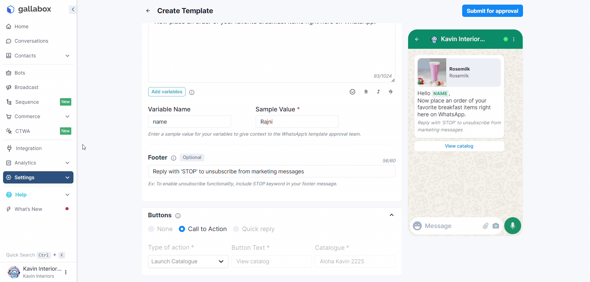 1. To create the Catalog Message template in Gallabox, go to **Settings.** From the dropdown select **WhatsApp templates.**&#x20;