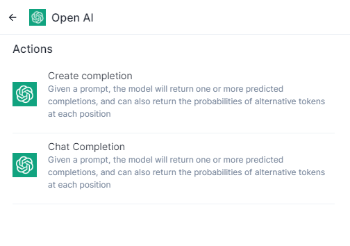 2. After clicking on Open AI Connector, you will see the actions - Create Completion and Chat Completion.&#x20;