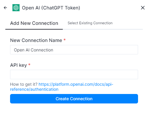 3. After you click on one of the Actions, it will ask you to Add New Connection or Select Existing Connection. If you haven't made any connection, see if the Connection Name is fine with you and proceed with pasting the API Key. You will find the guide to find the key [here](https://platform.openai.com/docs/api-reference/authentication).&#x20;
