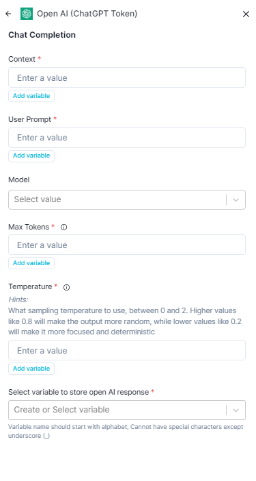 2. After clicking on connect the selected the Action - **Chat Completion** opens and you will have to edit the value for Context, user prompt, Model, Max Tokens, Temperature, and the variable. <br>