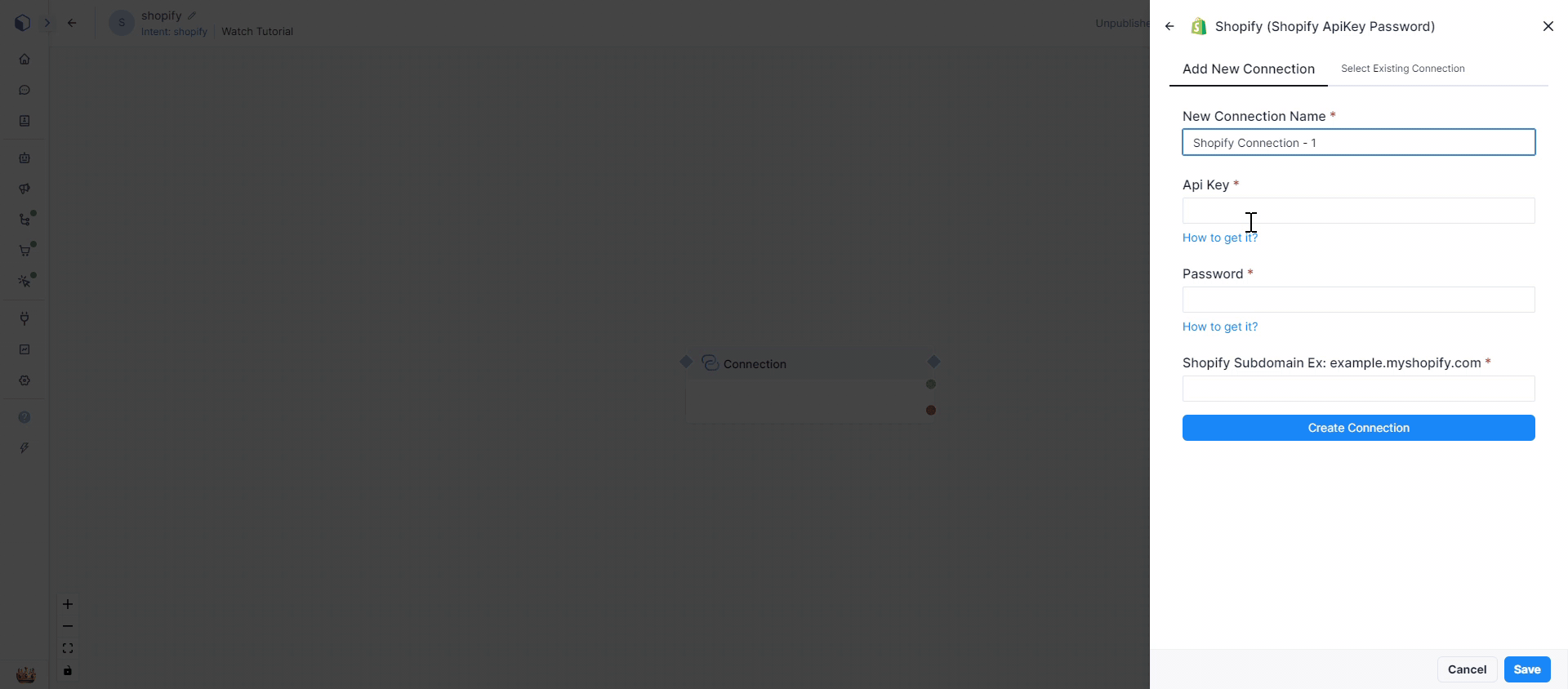 3. If you haven't made any connection, you will have to enter [API Key](#shopify-api-key-and-secret), [Password](#shopify-api-key-and-secret), and Shopify Subdomain and click on **Create Connection**. Once you paste the API Key, Password, and Shopify Subdomain click on Create Connection.