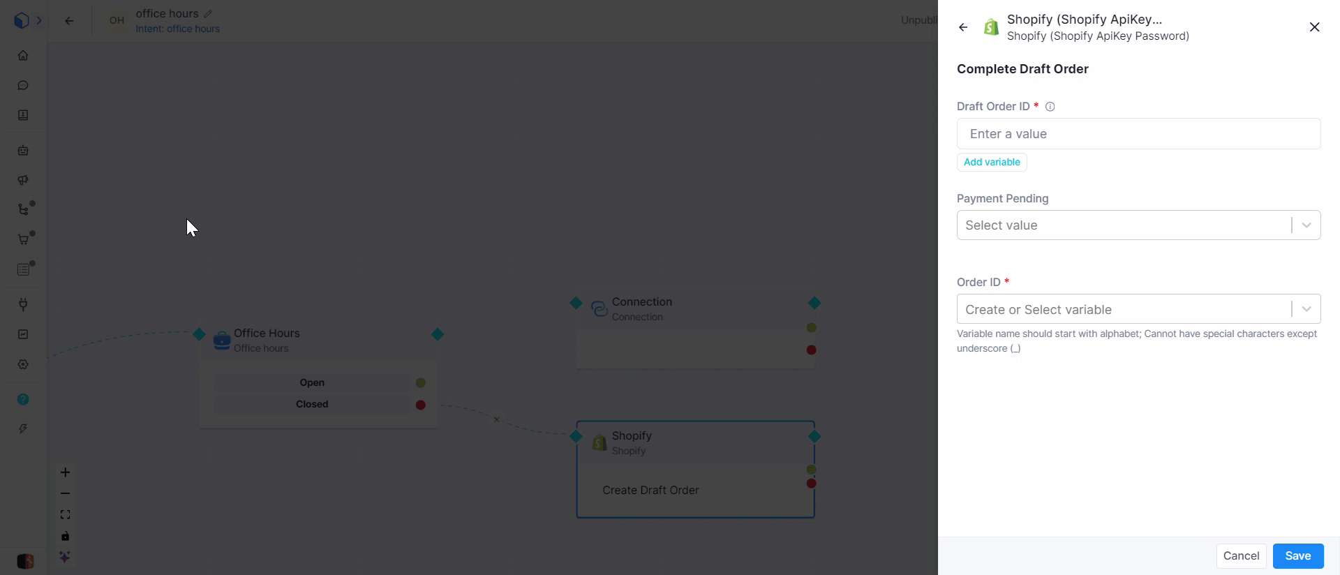 <table><thead><tr><th width="182">Field Name</th><th>Field Description</th></tr></thead><tbody><tr><td>Draft Order Id</td><td>Insert the variable under which temporary order is created in Shopify before customer payment or confirmation.</td></tr><tr><td>Payment Pending</td><td>Choose either True or False for the payment of that order.</td></tr><tr><td>Order Id</td><td>Insert the variable to store the finalized order Id in Shopify post payment confirmation by the customer.</td></tr></tbody></table>