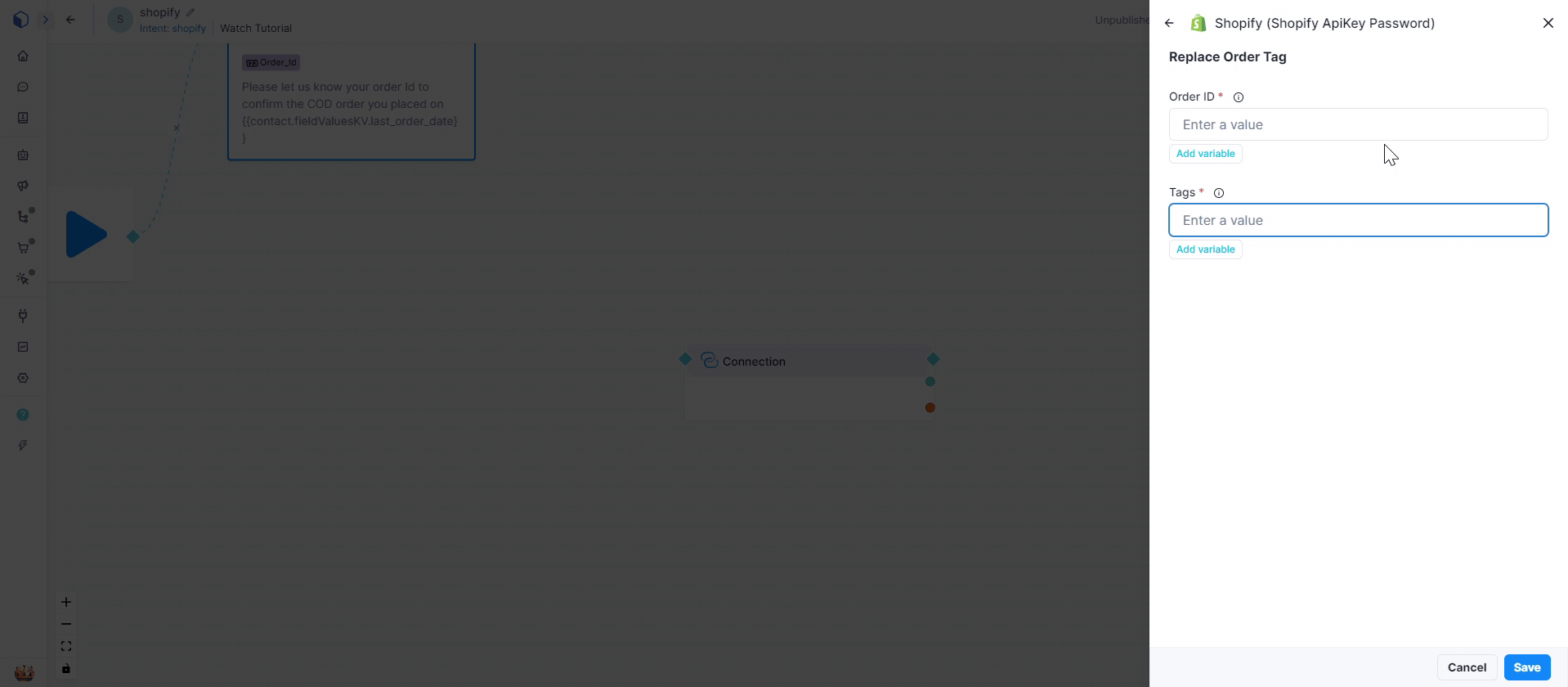 With your Shopify connector configured, effortlessly manage orders and draft orders. Follow the steps outlined in this guide to ensure accurate data input, whether it's replacing order tags or creating new orders. Optimize your Shopify integration by adding the right variables and values, making your chat-flow a powerful asset for streamlined e-commerce management.