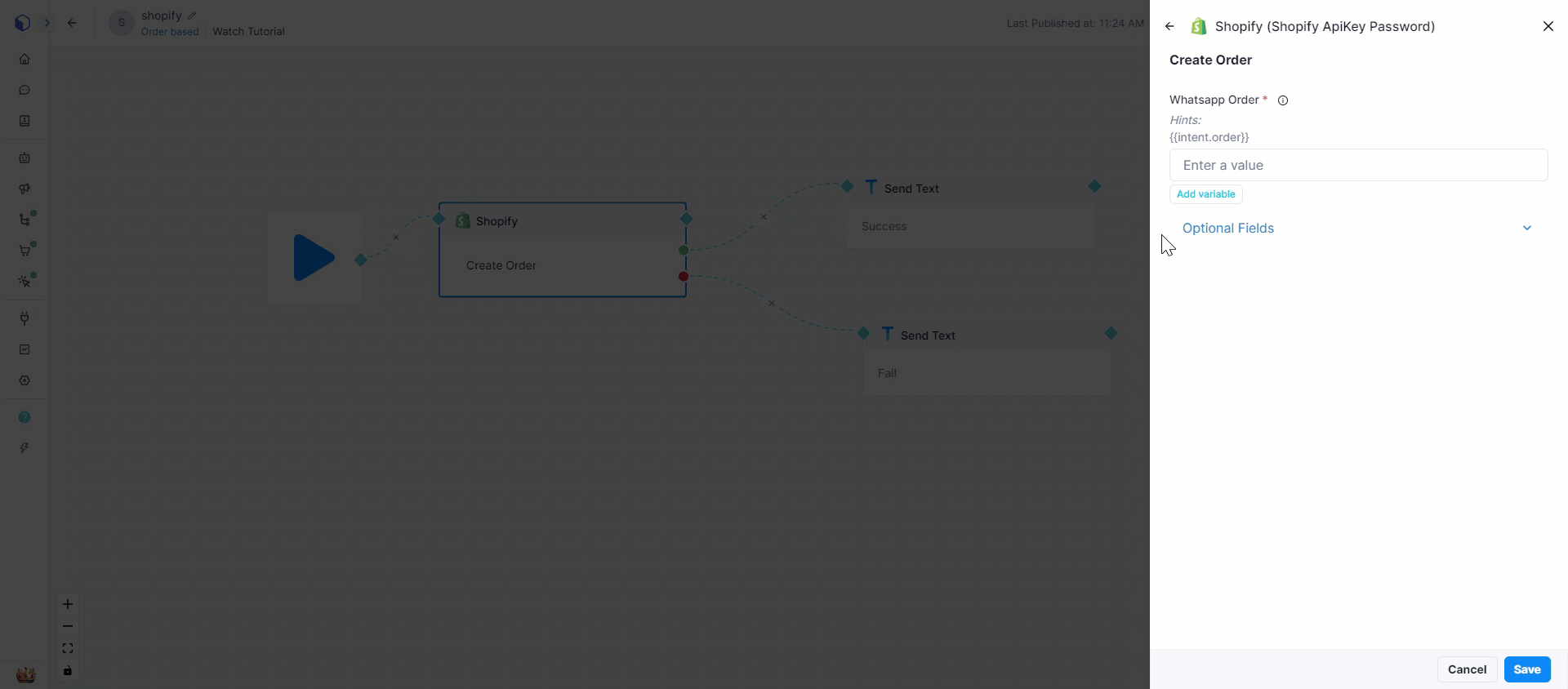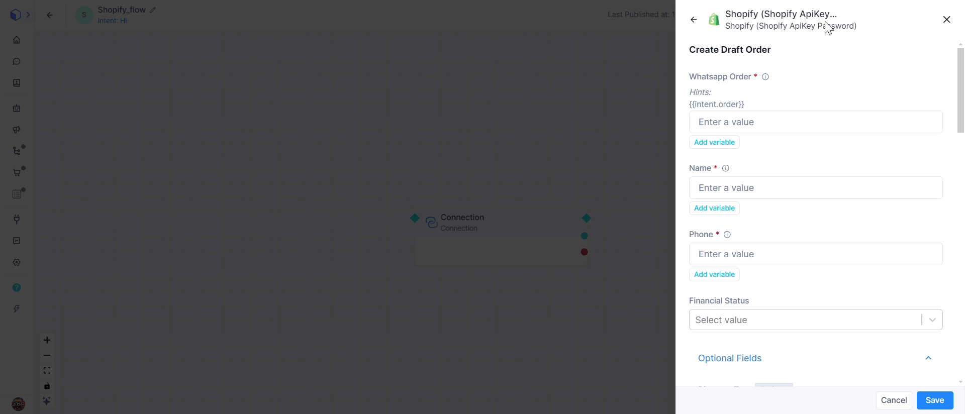 <table><thead><tr><th width="182">Fields</th><th>Description</th></tr></thead><tbody><tr><td>Whatsapp Order*</td><td>Indicates an order initiated through a WhatsApp integration. Example: <code>{{intent.order}}</code></td></tr><tr><td>Name*</td><td>Add a variable under which the values for customer's name is saved. Example: <code>{{recipient.name}}</code></td></tr><tr><td>Phone*</td><td>Add a variable under which the values for customer's phone number are saved. Example: <code>{{recipient.phone}}</code></td></tr><tr><td>Financial Status</td><td>Choose from the dropdown the status of the order. Example: <code>Partially Paid</code></td></tr><tr><td>Discount Type</td><td>hoose from two options - Percentage or Fixed Amount.</td></tr><tr><td>Discount Value</td><td>Add a value for either percentage or any fixed amount. </td></tr><tr><td>Discount Title</td><td>he name or short description associated with a discount applied to an order. Example: <code>Summer Sale</code></td></tr><tr><td>Discount Description</td><td>Additional details explaining the discount applied to an order. Example: <code>10% off all items</code></td></tr><tr><td>Address</td><td>Customer's billing address associated with the order in Shopify.</td></tr><tr><td>City</td><td>City portion of the customer's billing address in Shopify</td></tr><tr><td>State</td><td>State or province portion of the customer's billing address in Shopify</td></tr><tr><td>Country</td><td>Country portion of the customer's billing address in Shopify.</td></tr><tr><td>Pin</td><td>Postal code associated with the billing address in Shopify.</td></tr><tr><td>Shipping address</td><td>Customer's address where the order will be shipped in Shopify.</td></tr><tr><td>Shipping City</td><td>Customer's city where the order will be shipped in Shopify.</td></tr><tr><td>Shipping State</td><td>Customer's state where the order will be shipped in Shopify.</td></tr><tr><td>Shipping Country</td><td>Customer's country where the order will be shipped in Shopify.</td></tr><tr><td>Shipping Pin code</td><td>Customer's postal code where the order will be shipped in Shopify.</td></tr><tr><td>Draft Order ID</td><td>Add a variable under which the Draft Order ID will be saved. Example: <code>order_created_manually</code></td></tr><tr><td>Invoice URL</td><td>Add a variable under which the Invoice URL will be saved. Example: <code>Invoice_URL_generated</code></td></tr></tbody></table>