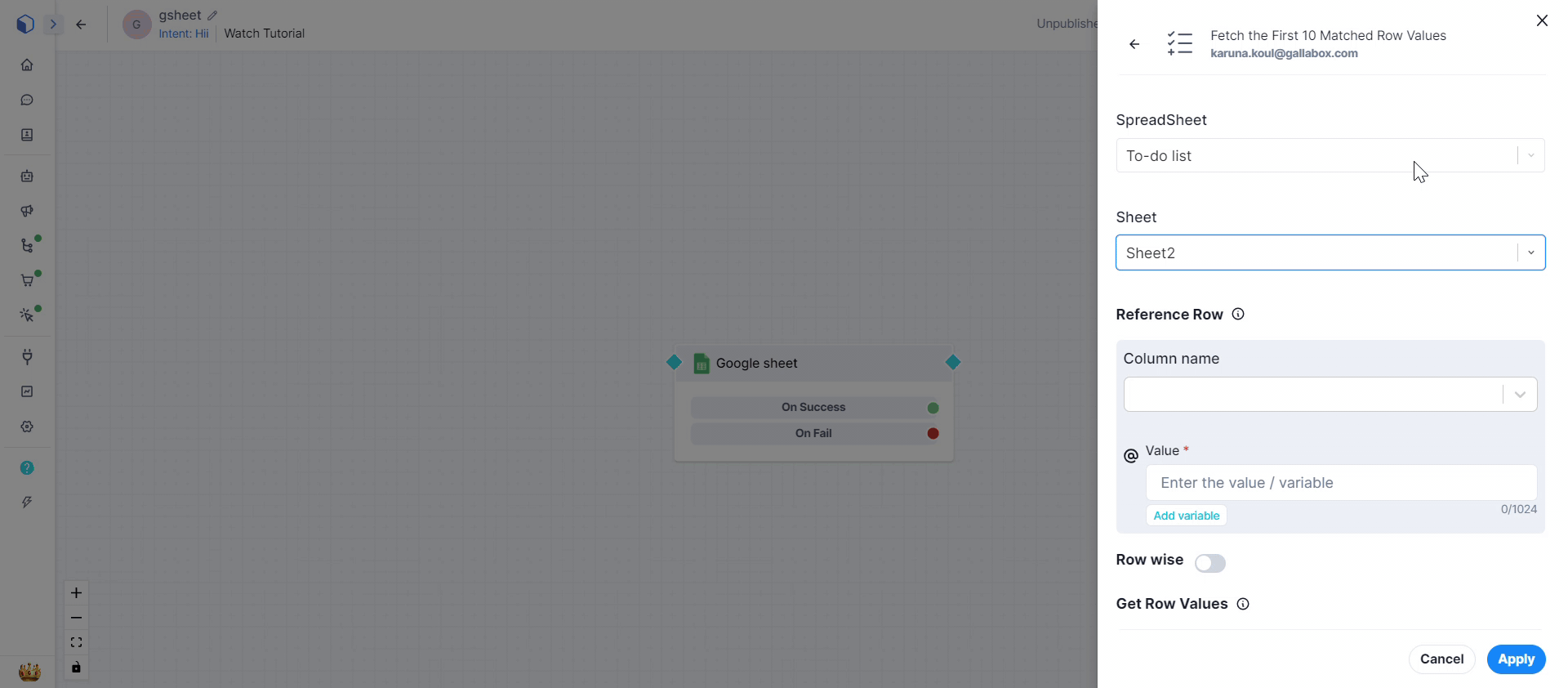 1. Go to **Google sheet Connector** click on Action - **Fetch the first 10 matched Row Value**. Select the connection - Test you created before to edit the Action as shown in the below GIF.&#x20;