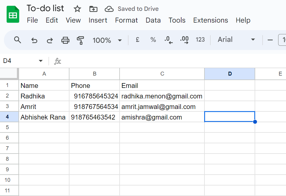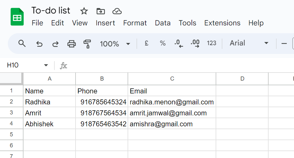 4. After bot gets triggered and the customer responds to it, that data will be captured in Google Sheet as shown below: