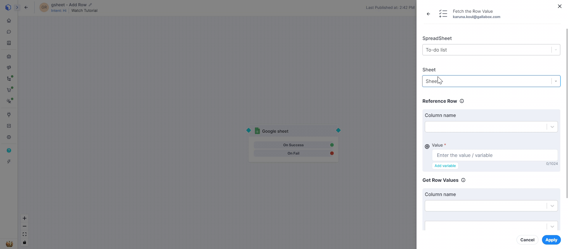 1. Go to **Google sheet Connector** click on Action - **Fetch the Row Value**. Select the connection - Test you created before to edit the Action as shown in the below GIF.&#x20;
