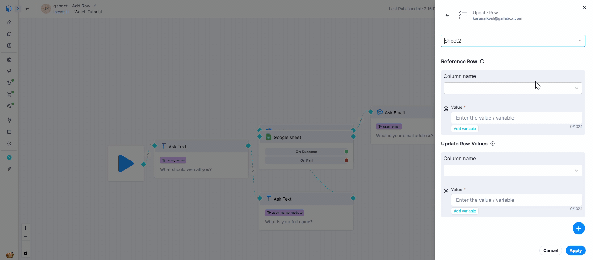 3. To add the row values, you have to select the Column name (from the sheet you choose in the previous step) from the dropdown and for the value, you have to select the variable that you have defined to store the value from the user. \