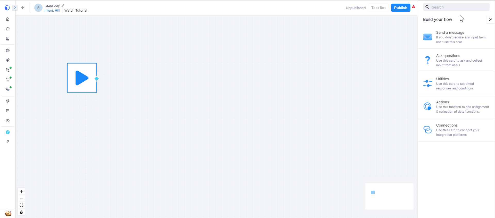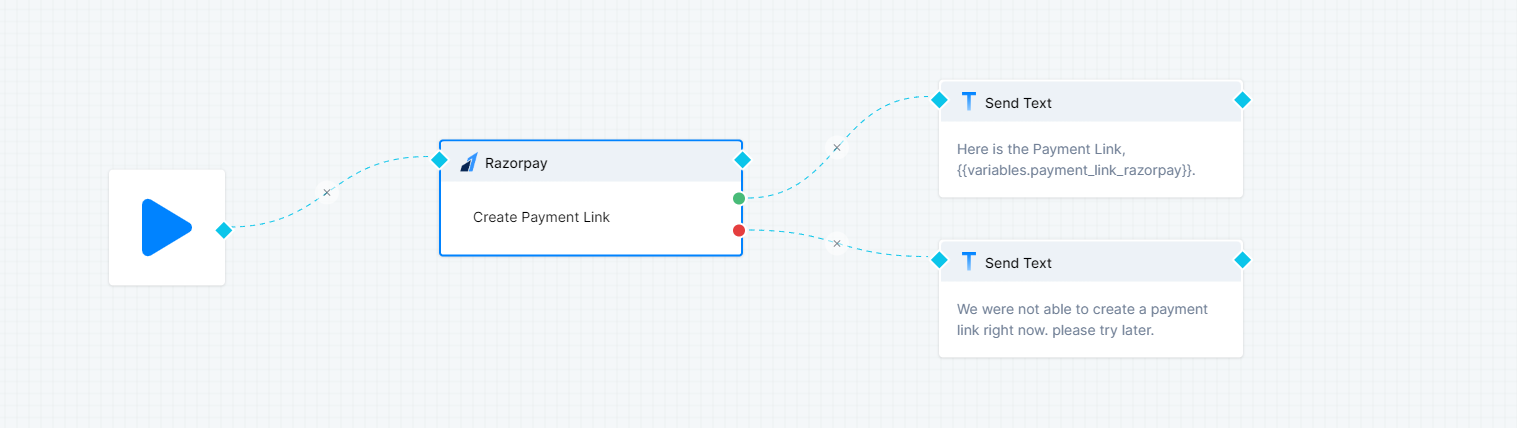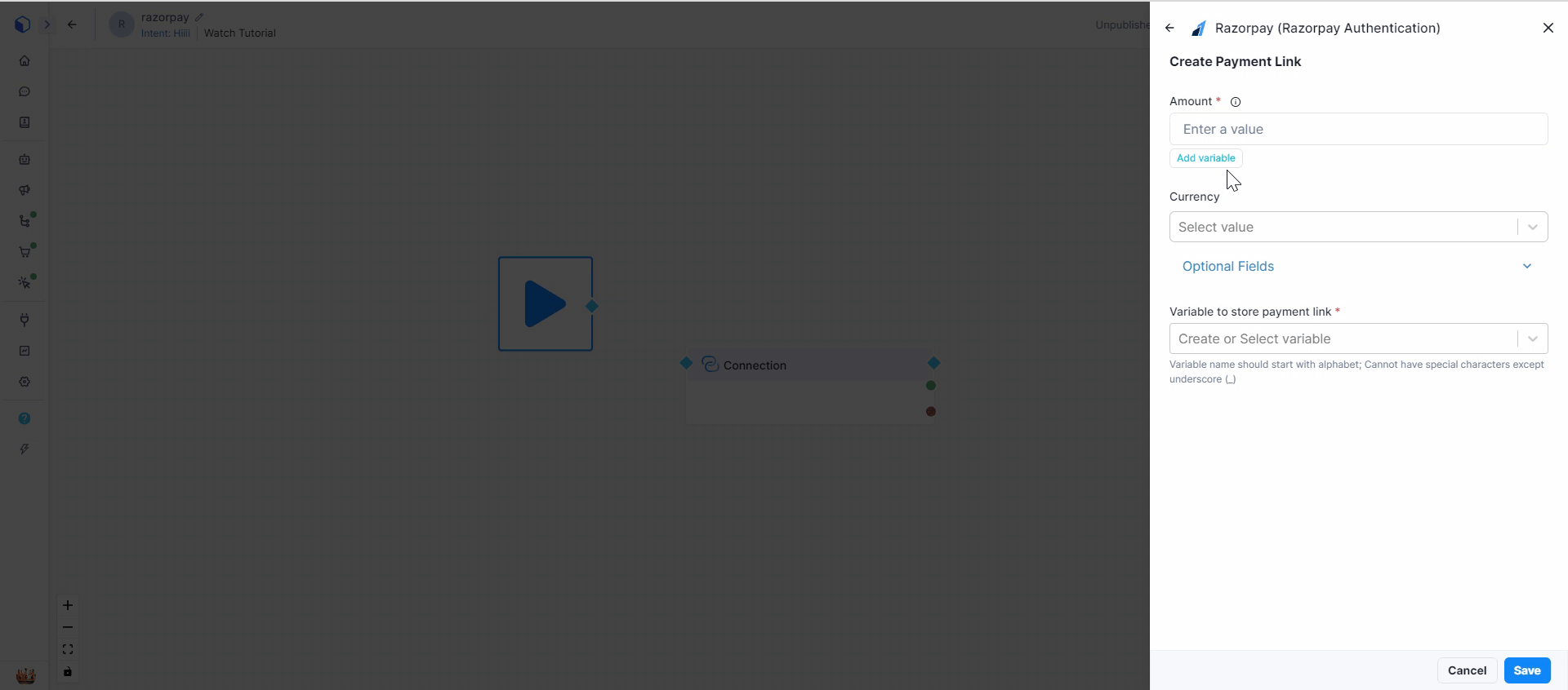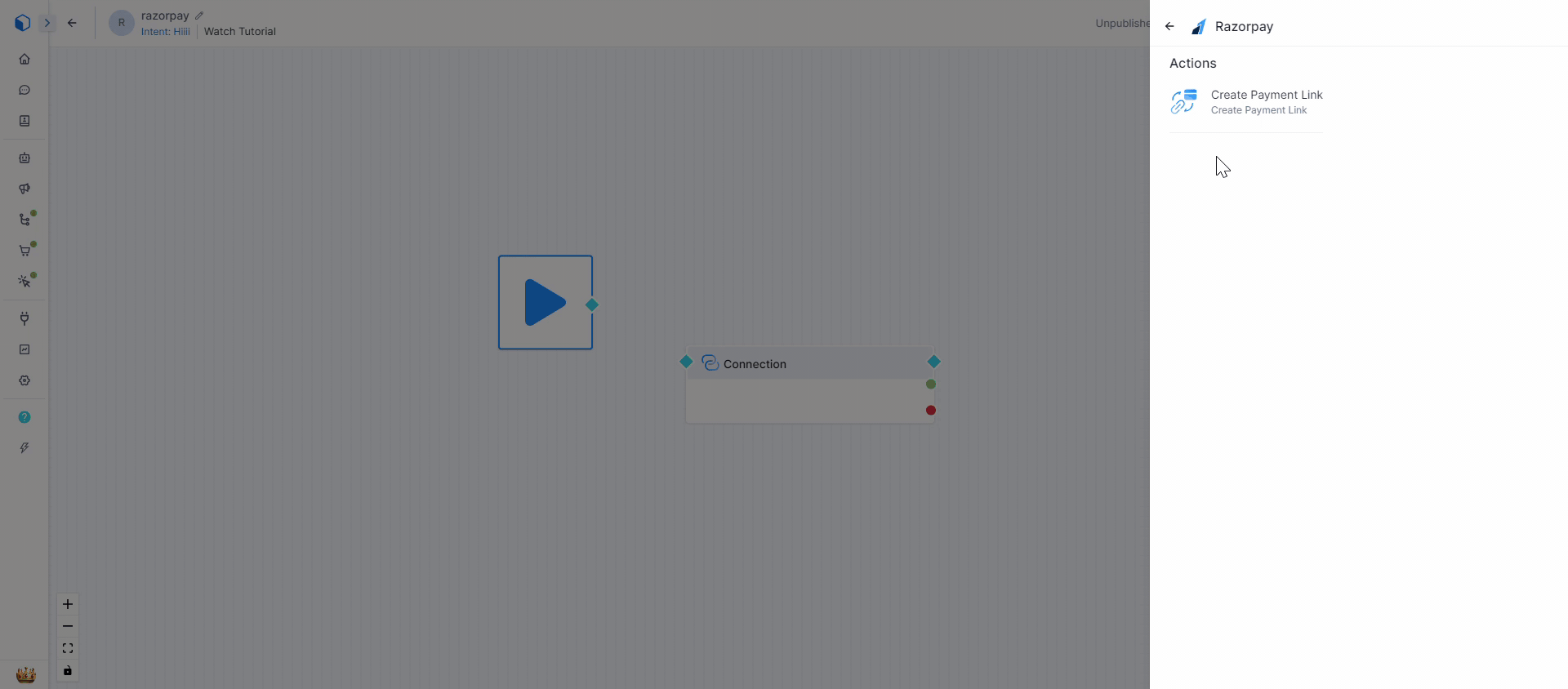 Using this connector, you can create a payment link to be sent to the customers via the send card in the chat-flow. Let's see the steps involved in creating a payment link via Razorpay.