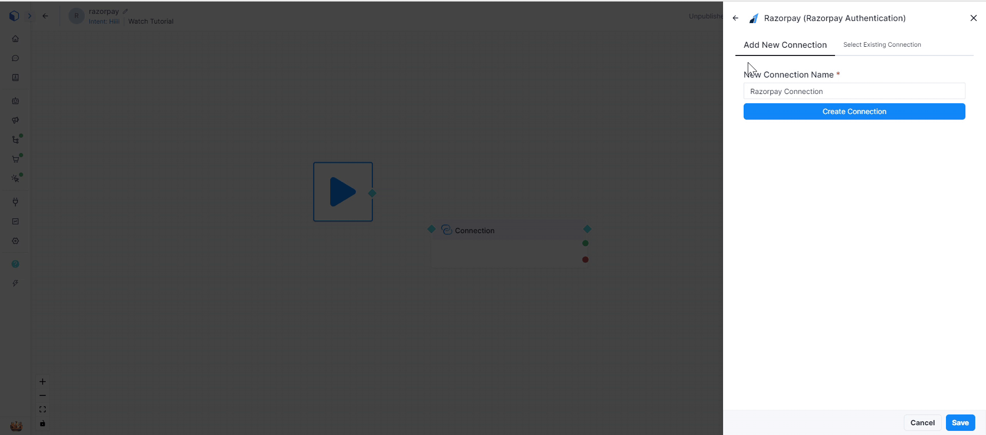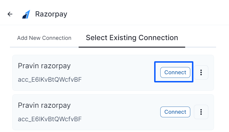 <figure><img src="https://3137140735-files.gitbook.io/~/files/v0/b/gitbook-x-prod.appspot.com/o/spaces%2FZcl3T6ePz95GpzjAeOLW%2Fuploads%2FFKi22ylIEgAZchqTGlAB%2FRazorPay%20Connector1.1.png?alt=media&#x26;token=125dade3-69b1-4781-a66c-0ab9e9403337" alt=""><figcaption><p>Selecting existing connection</p></figcaption></figure>