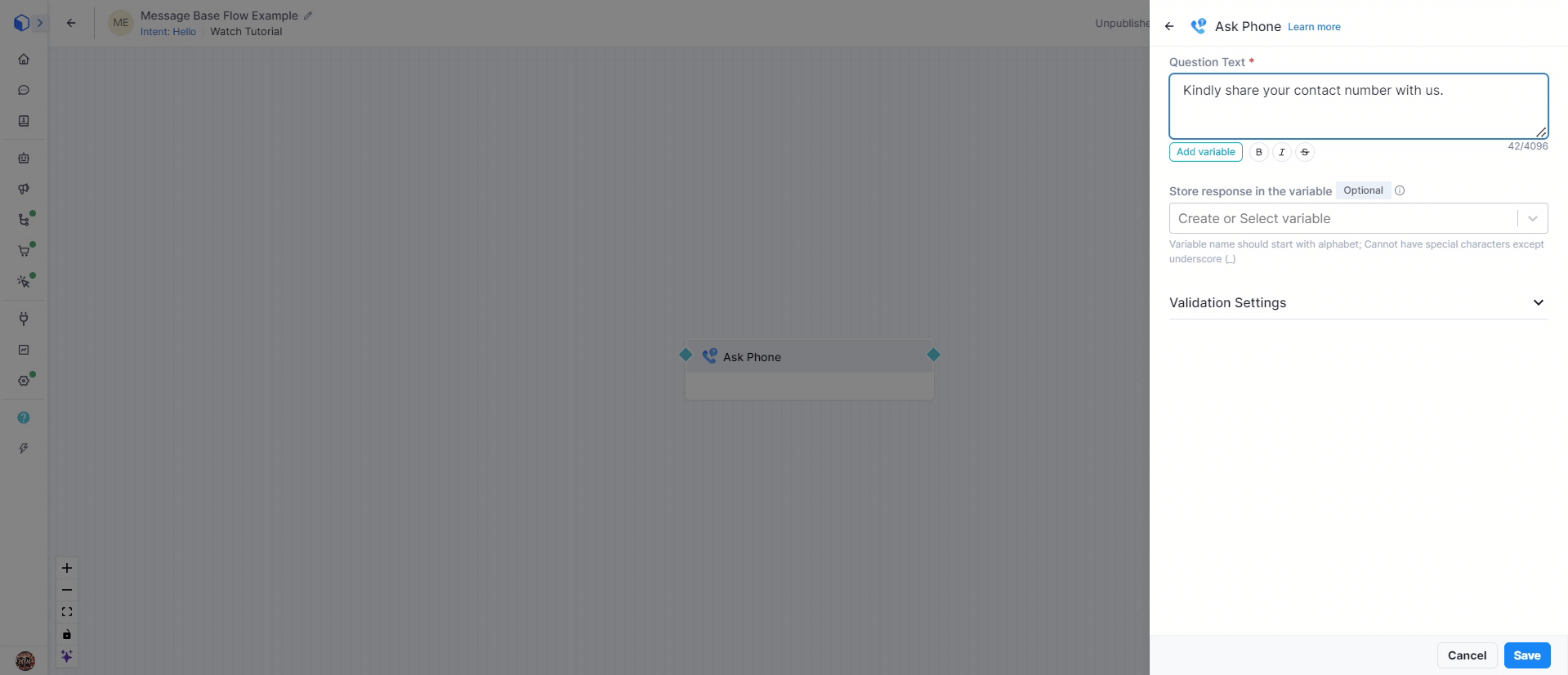 <figure><img src="https://3137140735-files.gitbook.io/~/files/v0/b/gitbook-x-prod.appspot.com/o/spaces%2FZcl3T6ePz95GpzjAeOLW%2Fuploads%2FNB1CjCdS0tBxnkVE2t9P%2FExample%20-2-variable.gif?alt=media&#x26;token=6f1df32d-26ec-406b-9f11-a1c15c5c146c" alt=""><figcaption><p>Variable to store customer's phone number</p></figcaption></figure>