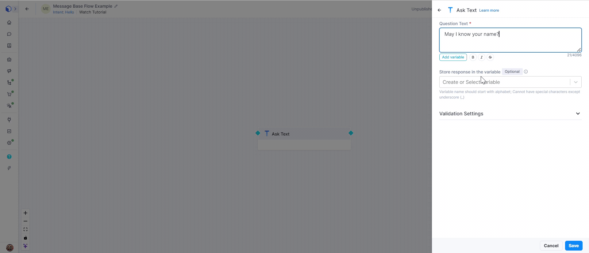 <figure><img src="https://3137140735-files.gitbook.io/~/files/v0/b/gitbook-x-prod.appspot.com/o/spaces%2FZcl3T6ePz95GpzjAeOLW%2Fuploads%2FeYtxYjHRq4NMIZmCkaca%2FVariable%20-%20Example%201.gif?alt=media&#x26;token=ed93c1e9-7fd6-46ea-95a3-3c452b1b9032" alt=""><figcaption><p>Variable to store customer's name</p></figcaption></figure>