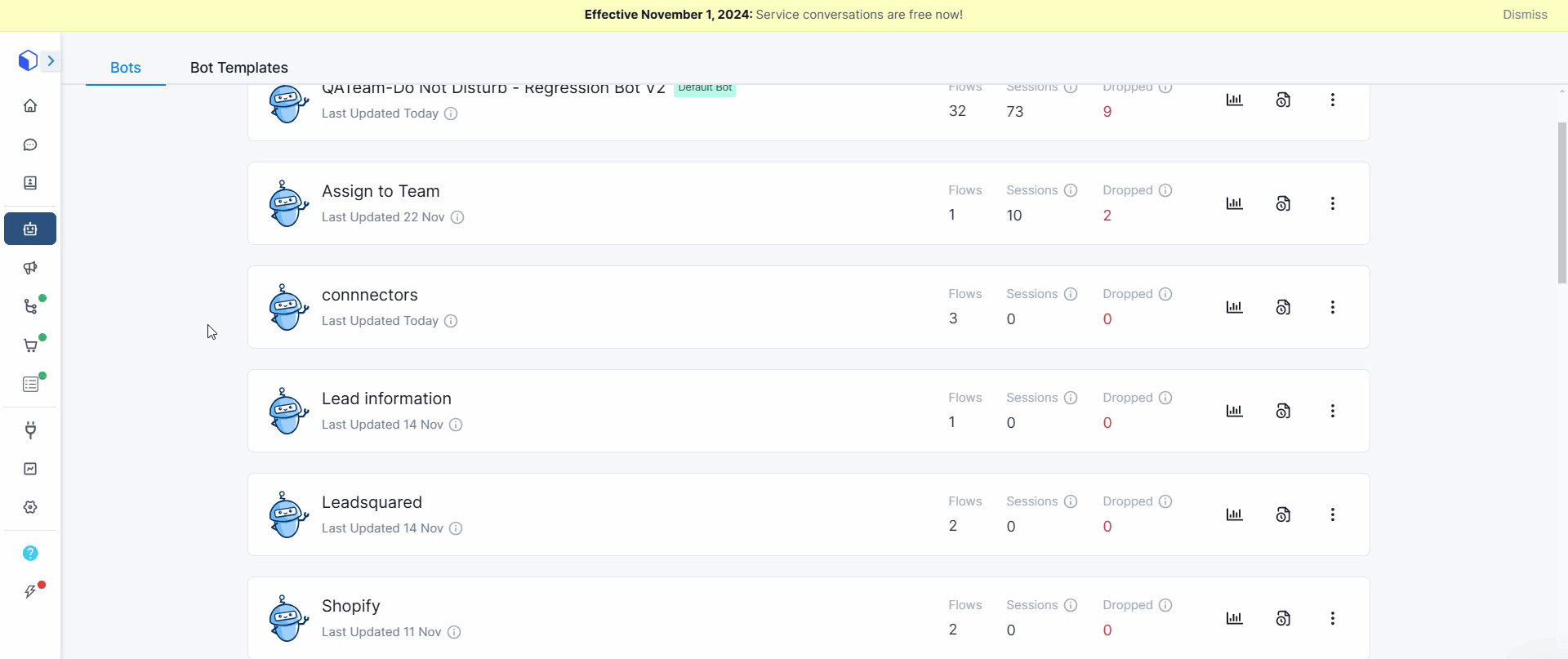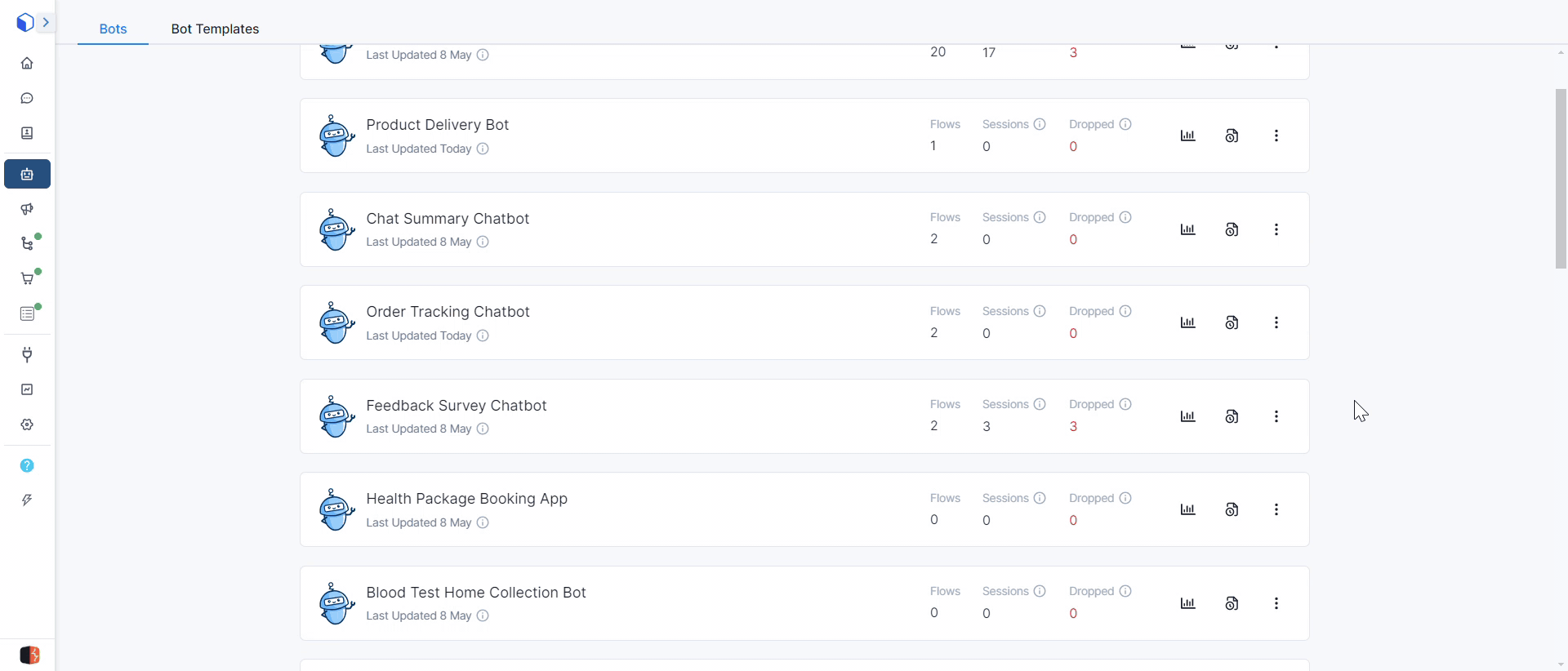 1. Under **Bots** click on the Bot for which you want to add the bot flows.&#x20;