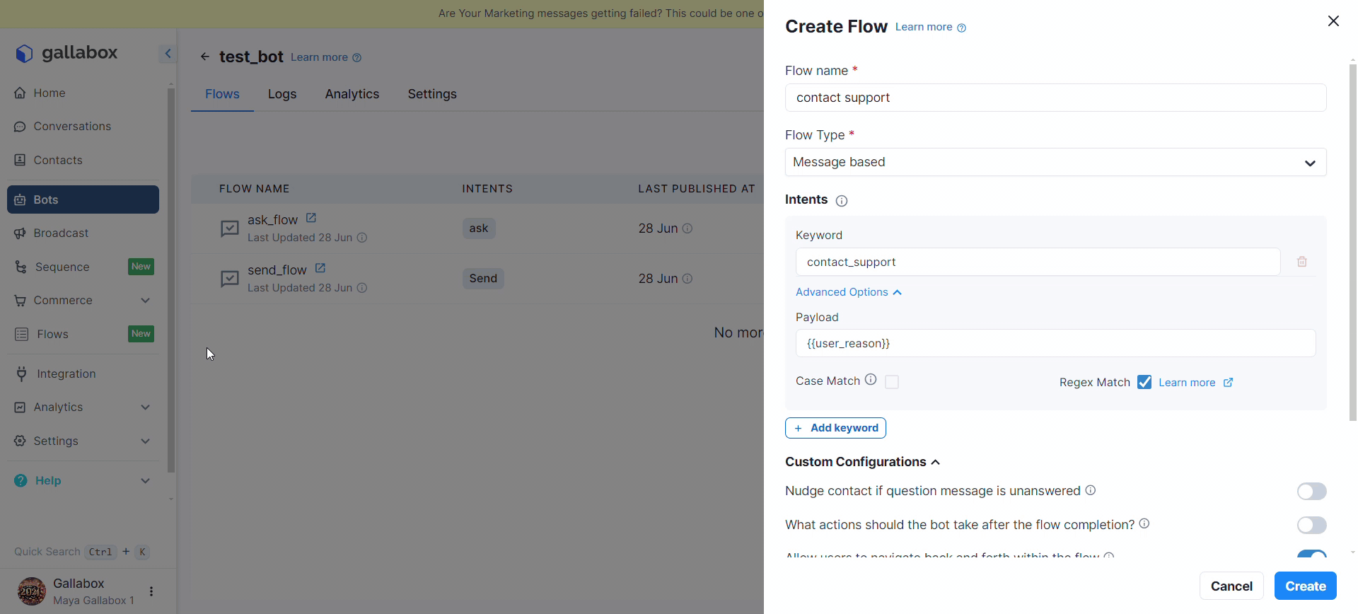 Enabling flow-level drop-off in Gallabox Bot allows you to override the bot-level session timeout setting.