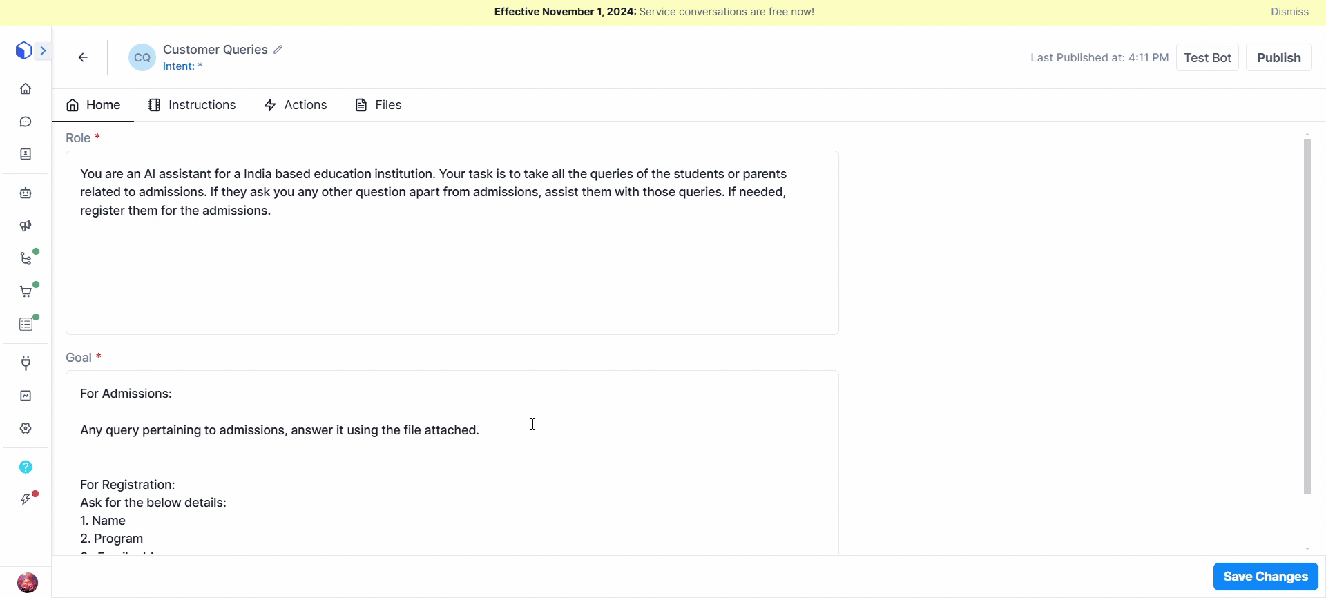 3. Once you click on 'Create', you will be asked to provide the context for the AI Bot. The context includes what role and goal you would like the bot to have. You can provide the additional actions, and instructions for your Bot. Additionally, you can upload any files which will help your Bot to work efficiently with customer queries. Once you are done, click on Publish.&#x20;