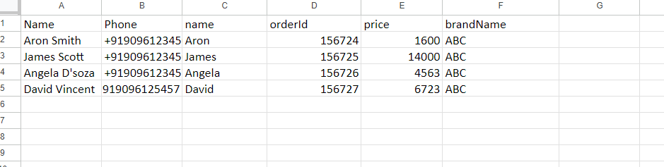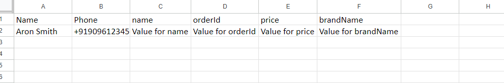 The Column Name 1 (in the above screenshot) is for the variables that you have defined in your Message Template. If your Message Template has 4 variables like {{name}}, {{orderId}}, {{price}}, and {{brandName}} then the sample file would be:&#x20;