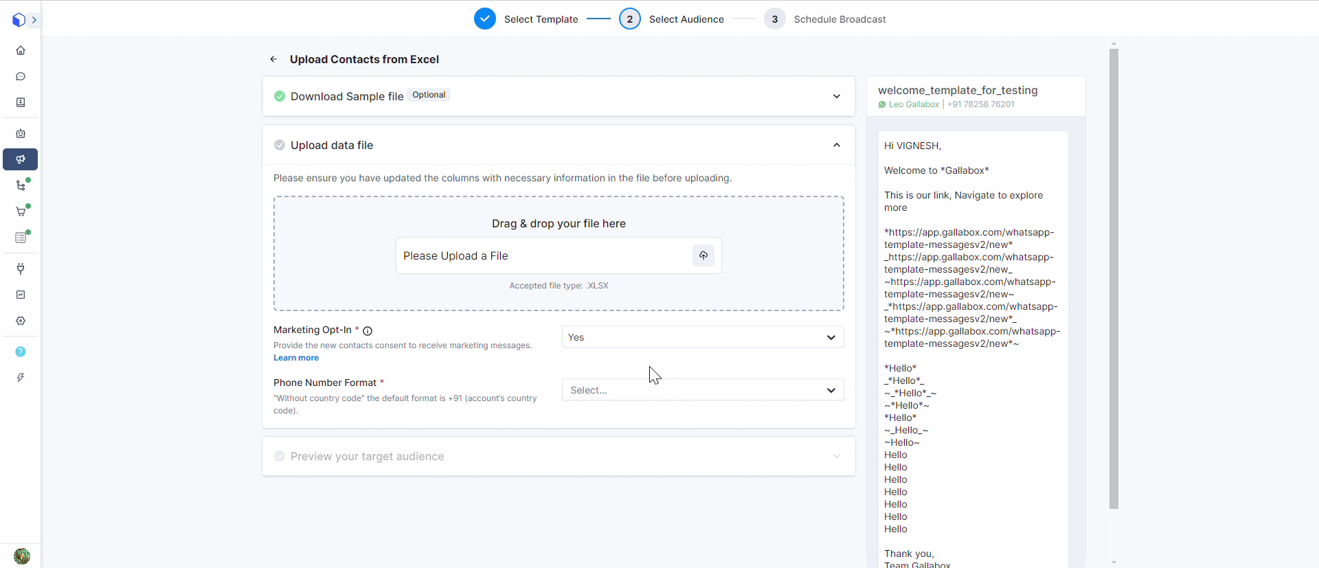 2. After you are done re-structuring the data as per the sample file, it is time to upload the excel file in Gallabox. Provide the Marketing - Opt in status and choose the Phone Number format to proceed with the broadcast.&#x20;