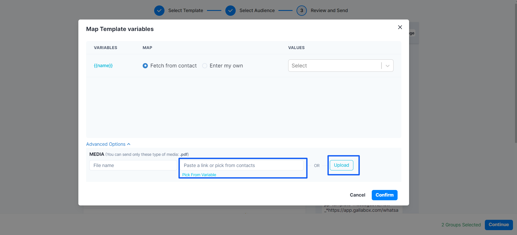 > 3) If your WhatsApp Template has a Media, you have the option to add a variable or upload the media file from your device.&#x20;