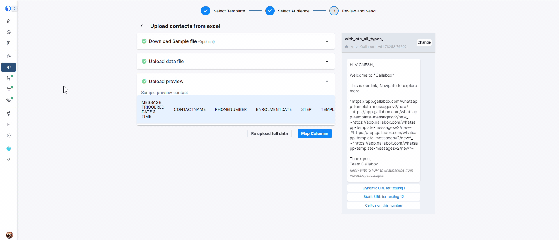 After the upload or selecting the contact group, you can preview the data to be mapped with the right values or variables.&#x20;