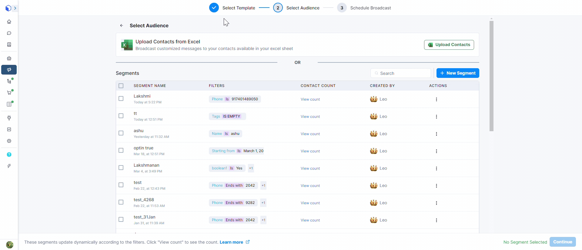 To select the target audience to send the Broadcast message, you can either choose to [Upload Contacts from Excel](#upload-contacts-from-excel) or [Select from Contact Group in Gallabox](#select-from-contact-group).&#x20;