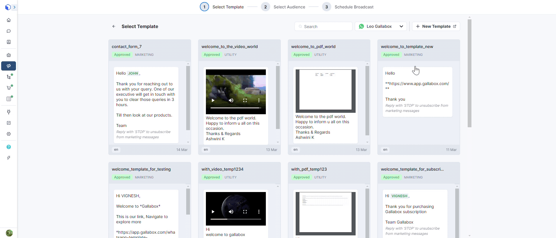 If you have already created a message template then you can click on **Select** button besides the template. You will be redirected to choosing the audience for the broadcast. If you haven't created any template for the Broadcast, Click on **"+New Template"** to create one for the campaign. [Guide](https://docs.gallabox.com/basic-modules/whatsapp-template-guidelines) on how to create a WhatsApp Template.&#x20;