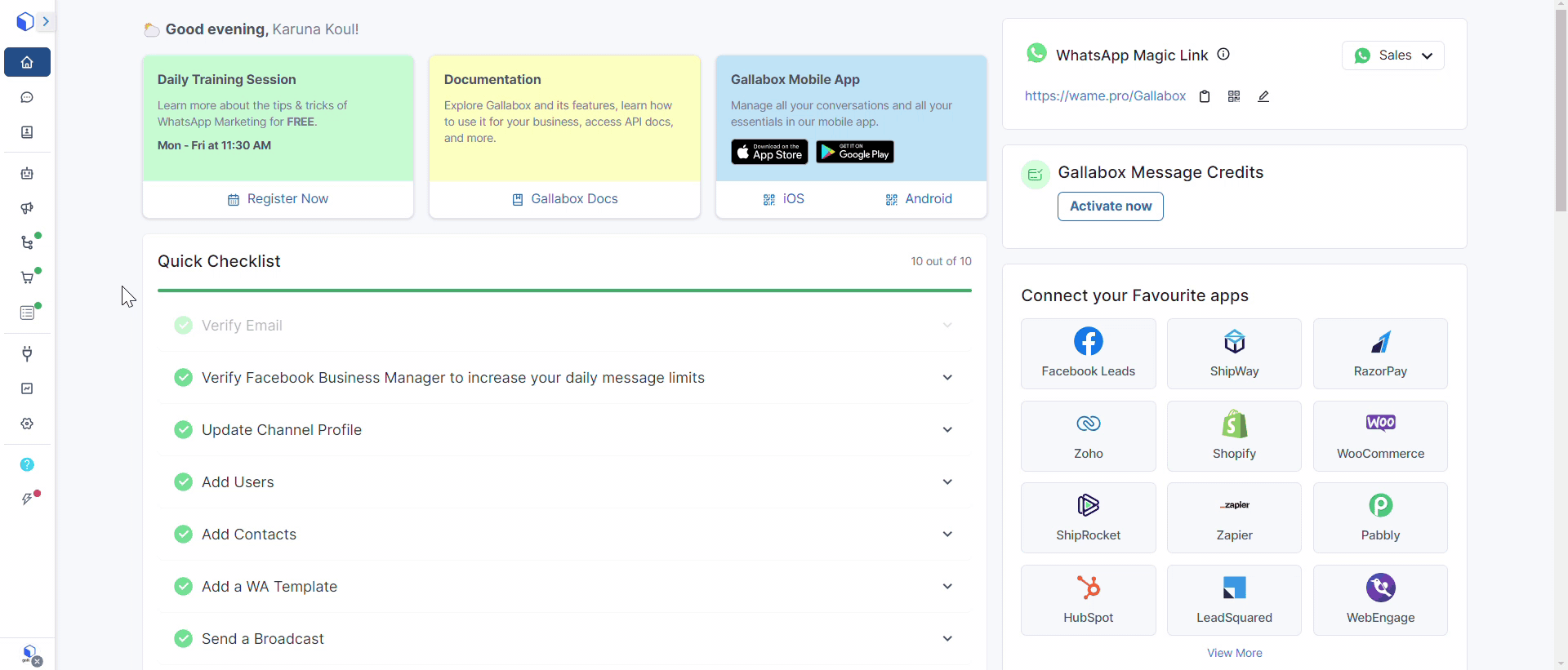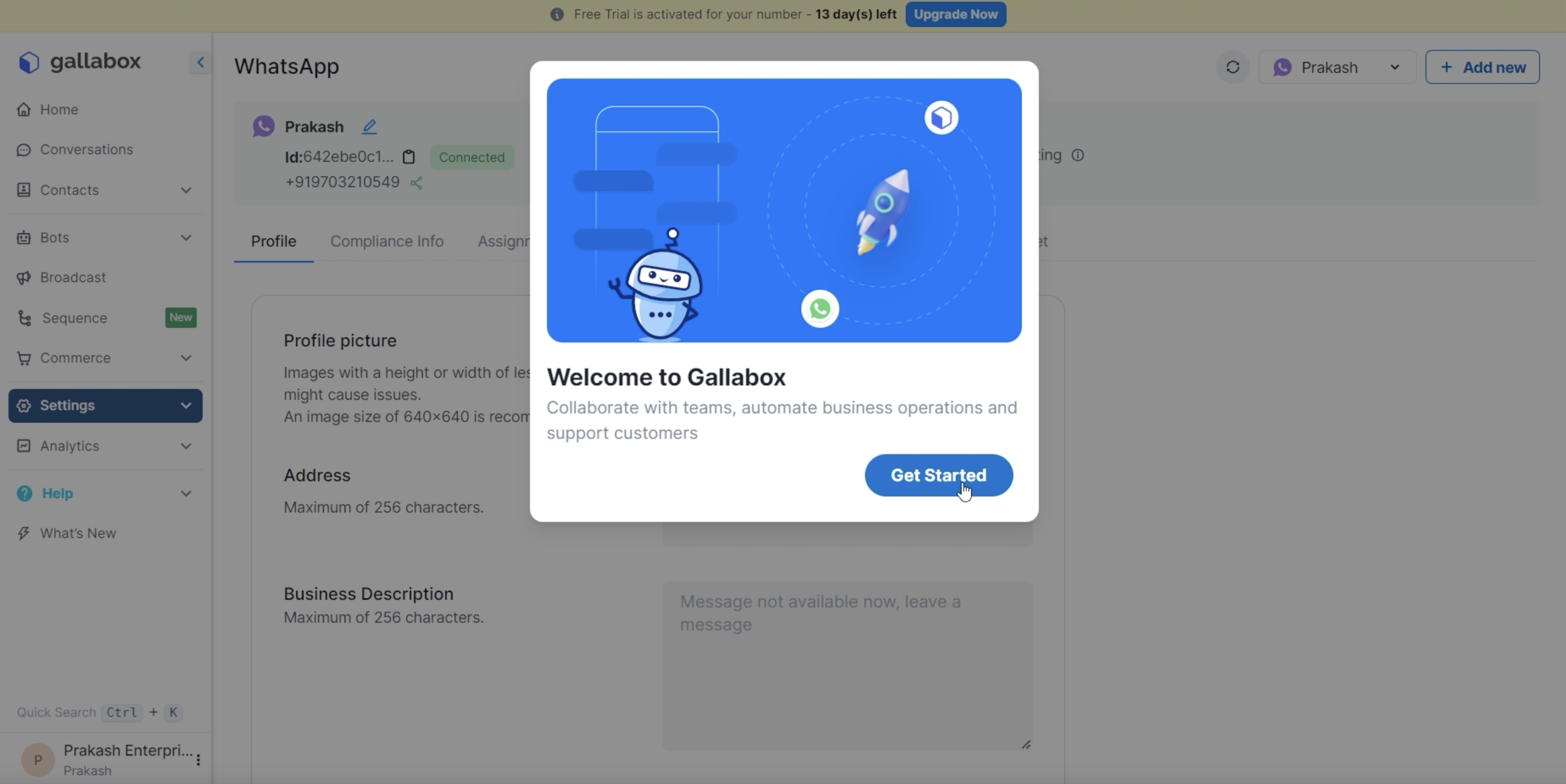 Congratulations! Your WhatsApp Number is now successfully connected with Gallabox, enhancing your communication capabilities within the platform.