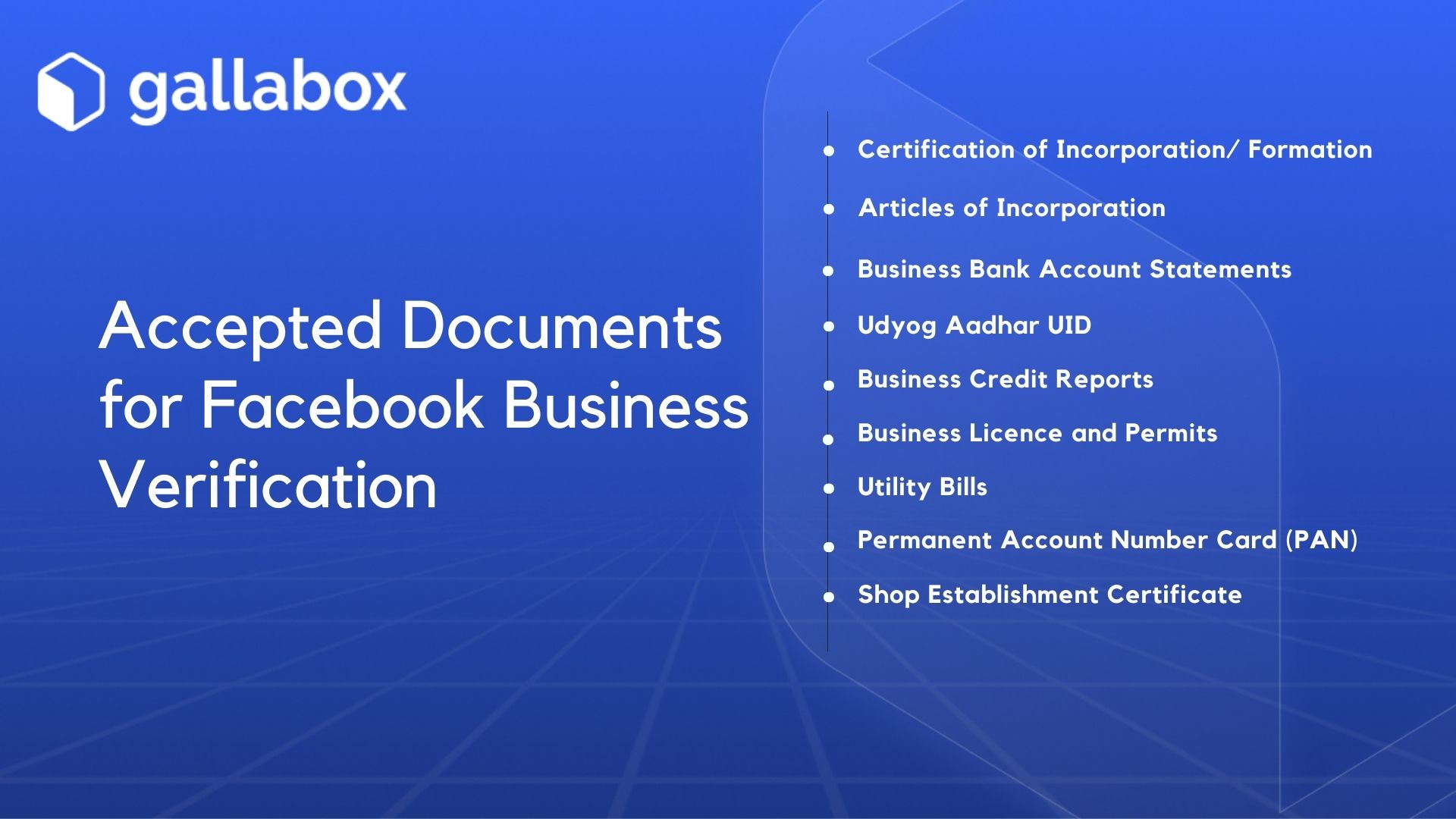 <figure><img src="https://3137140735-files.gitbook.io/~/files/v0/b/gitbook-x-prod.appspot.com/o/spaces%2FZcl3T6ePz95GpzjAeOLW%2Fuploads%2Fh0TCPEHB7nGIbhosQykM%2FAcceptable%20Documents%20for%20Facebook%20Business%20Verification.jpg?alt=media&#x26;token=316513bd-53a6-401b-b20a-d6cfe5adf958" alt=""><figcaption></figcaption></figure>