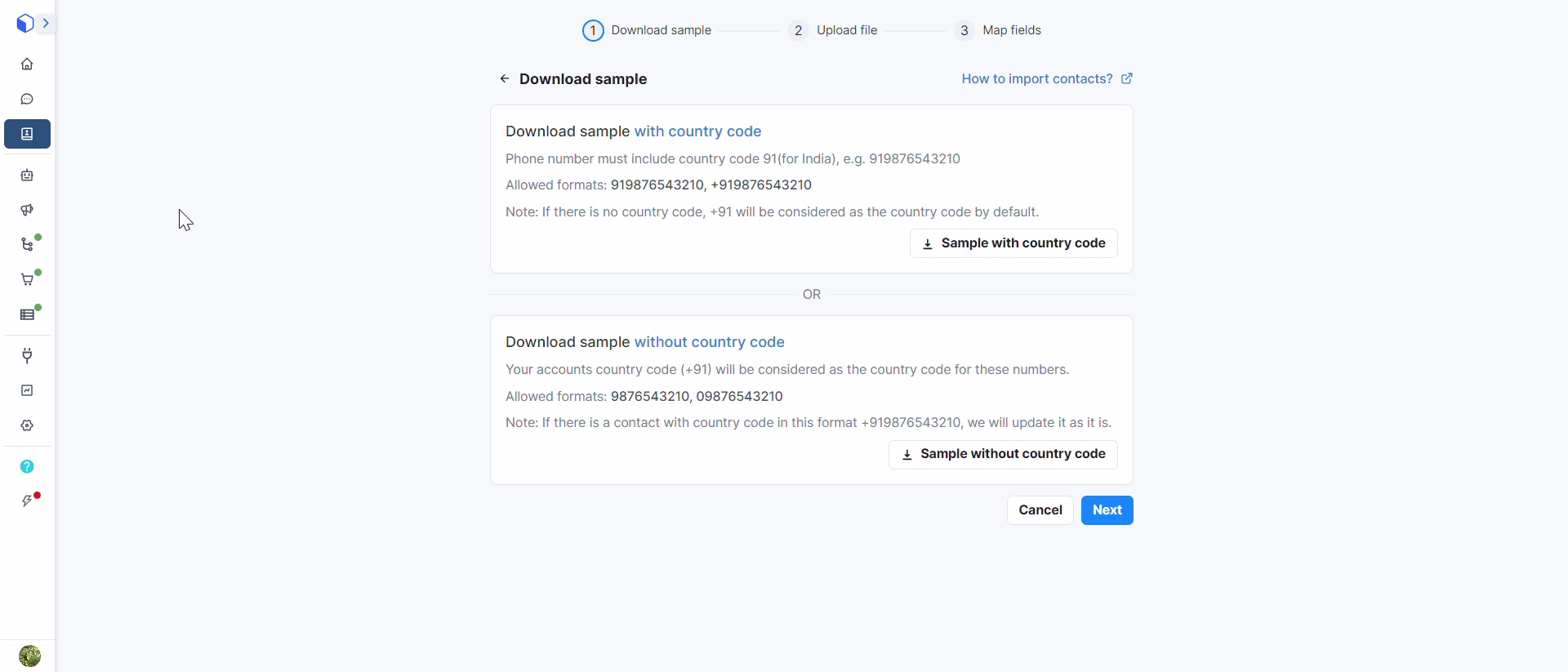 2. As a next step in the process, download a "**sample file**" for referencing. You can download the sample file either with Country Code or without Country Code.