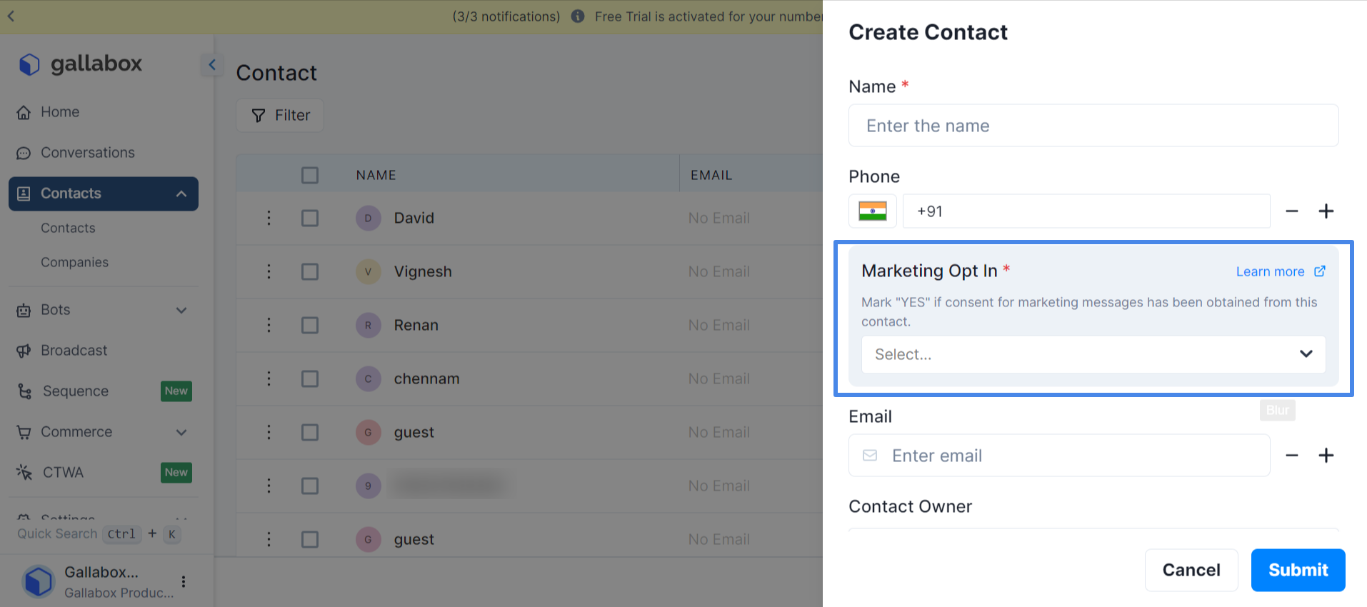 * If the field is set to **NO**, Gallabox will automatically detect it and skip sending marketing messages to this particular customer.