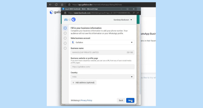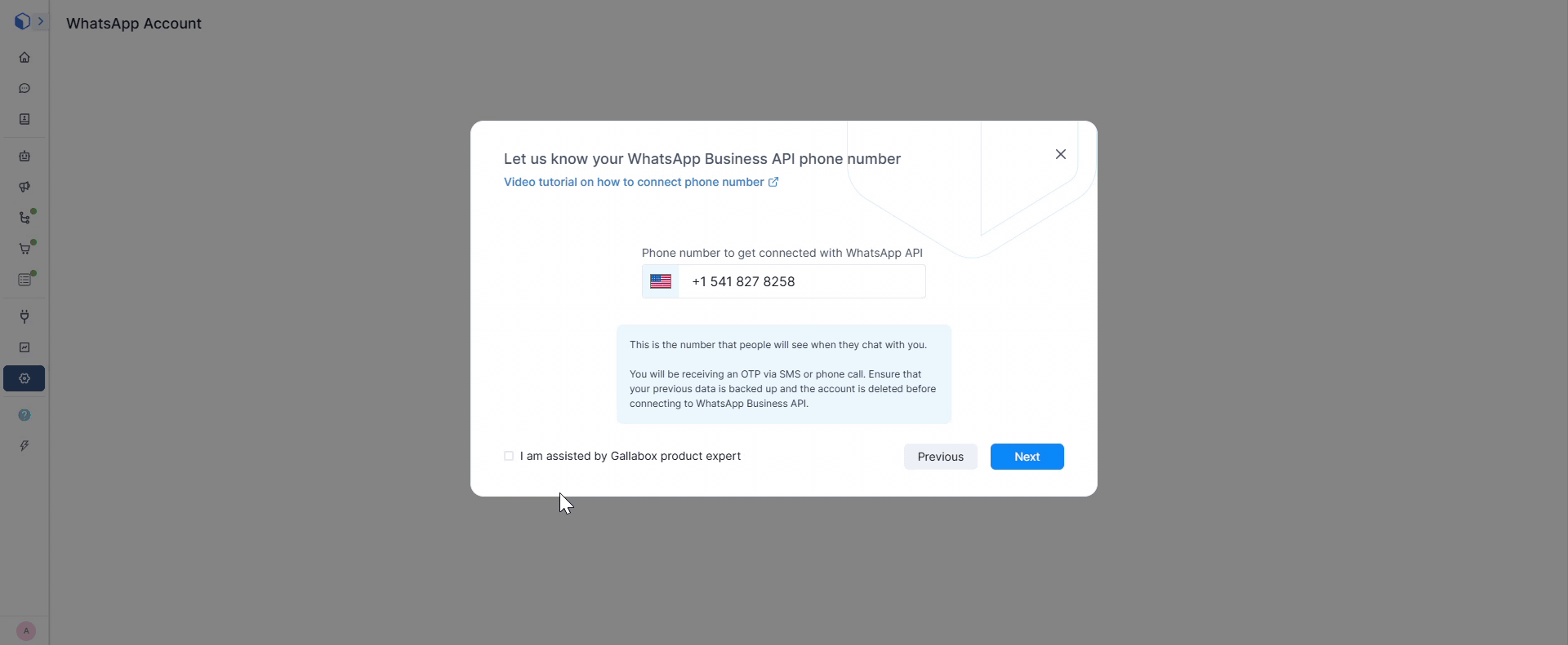 3. Enter the number you would like to connect with WhatsApp API using Gallabox. Click on Next.&#x20;