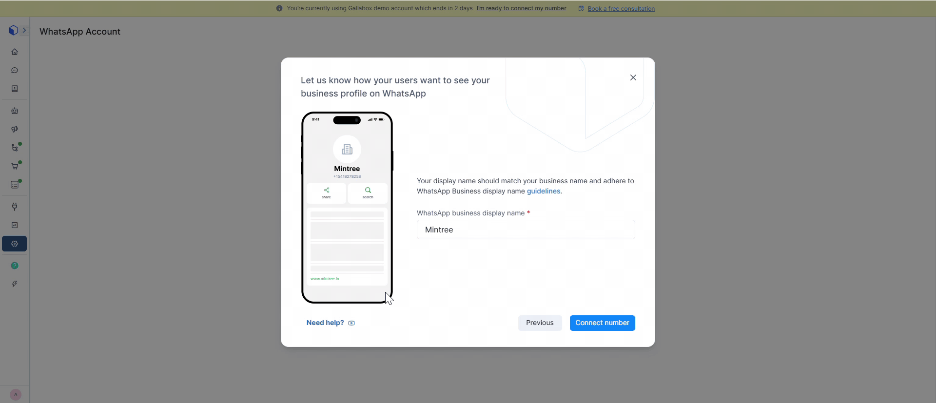 3. In the next step, enter your WhatsApp Display Name. Make sure your display name should adhere to the [guidelines ](https://www.facebook.com/business/help/757569725593362)set by META. Click on 'Connect Number' button.
