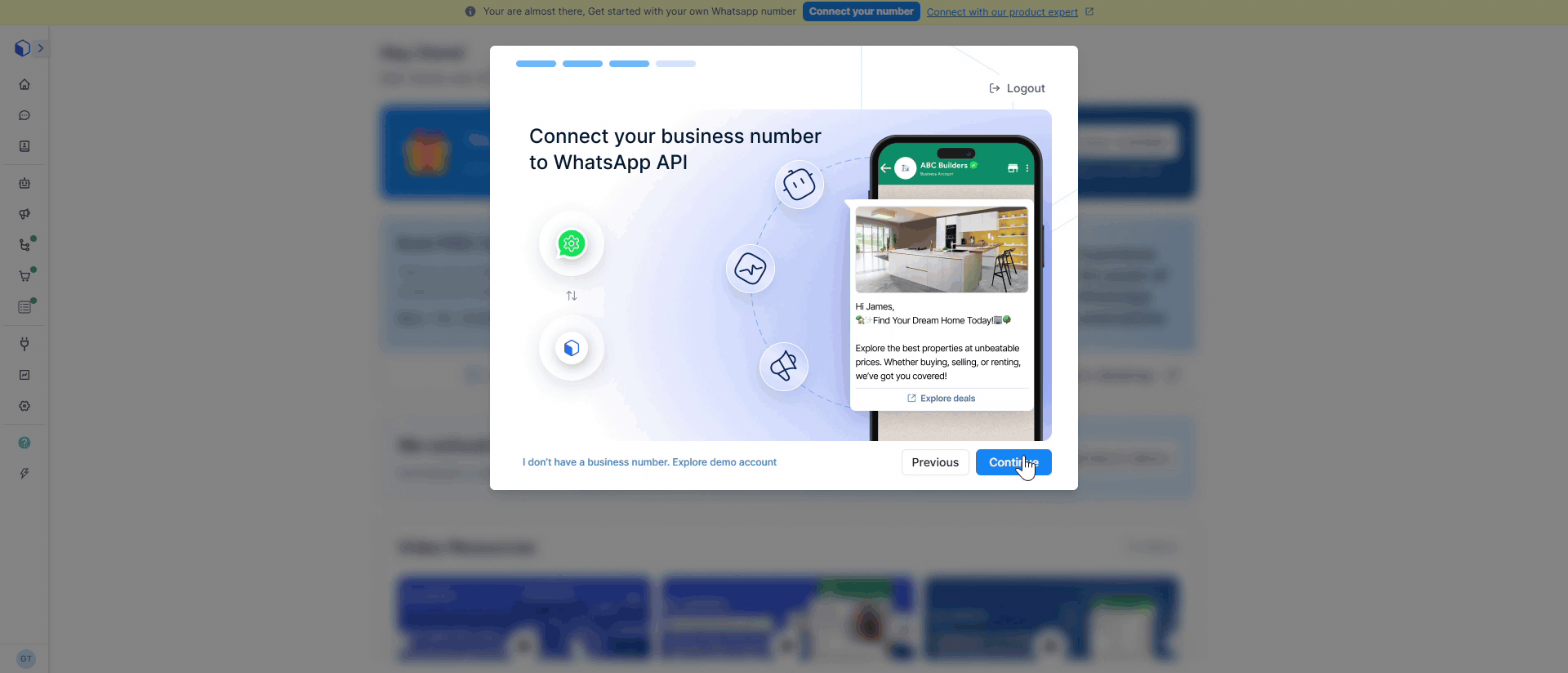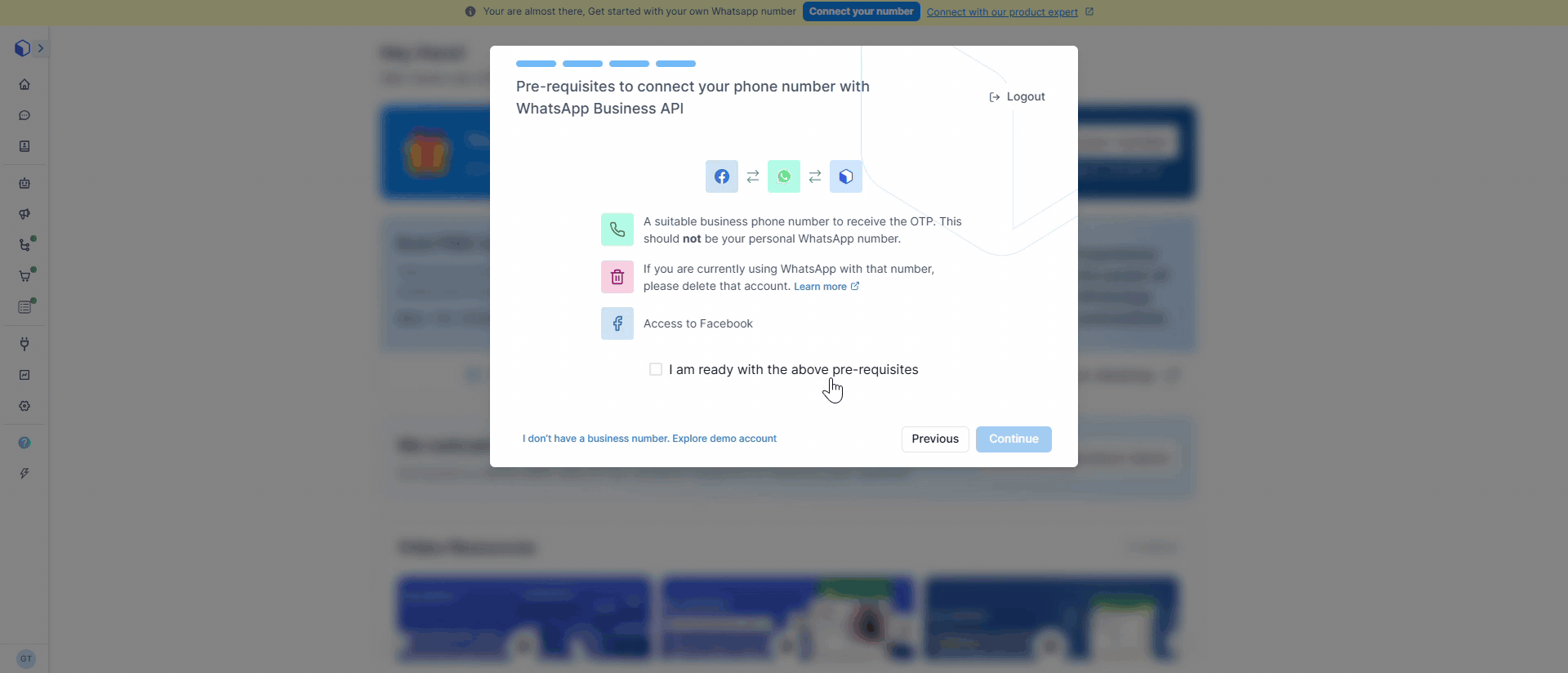 1. After personalizing your homepage, click on Continue. The pop-up will show the pre-requisites required to connect your WhatsApp Business Number.&#x20;