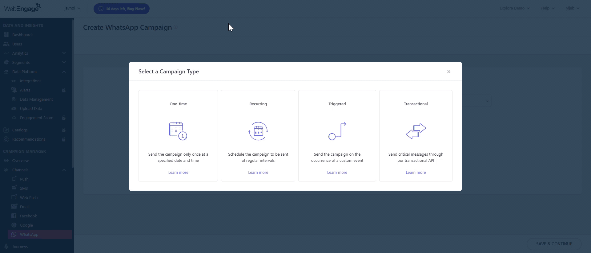 1. To create WhatsApp Campaigns in WebEngage, go to **Channels** under **Campaign Manager** and select **WhatsApp**. In the List of Campaigns window, click on **Create Campaign**. You'll be prompted to select the type of campaign: One-Time, Recurring, Triggered, or Transactional.