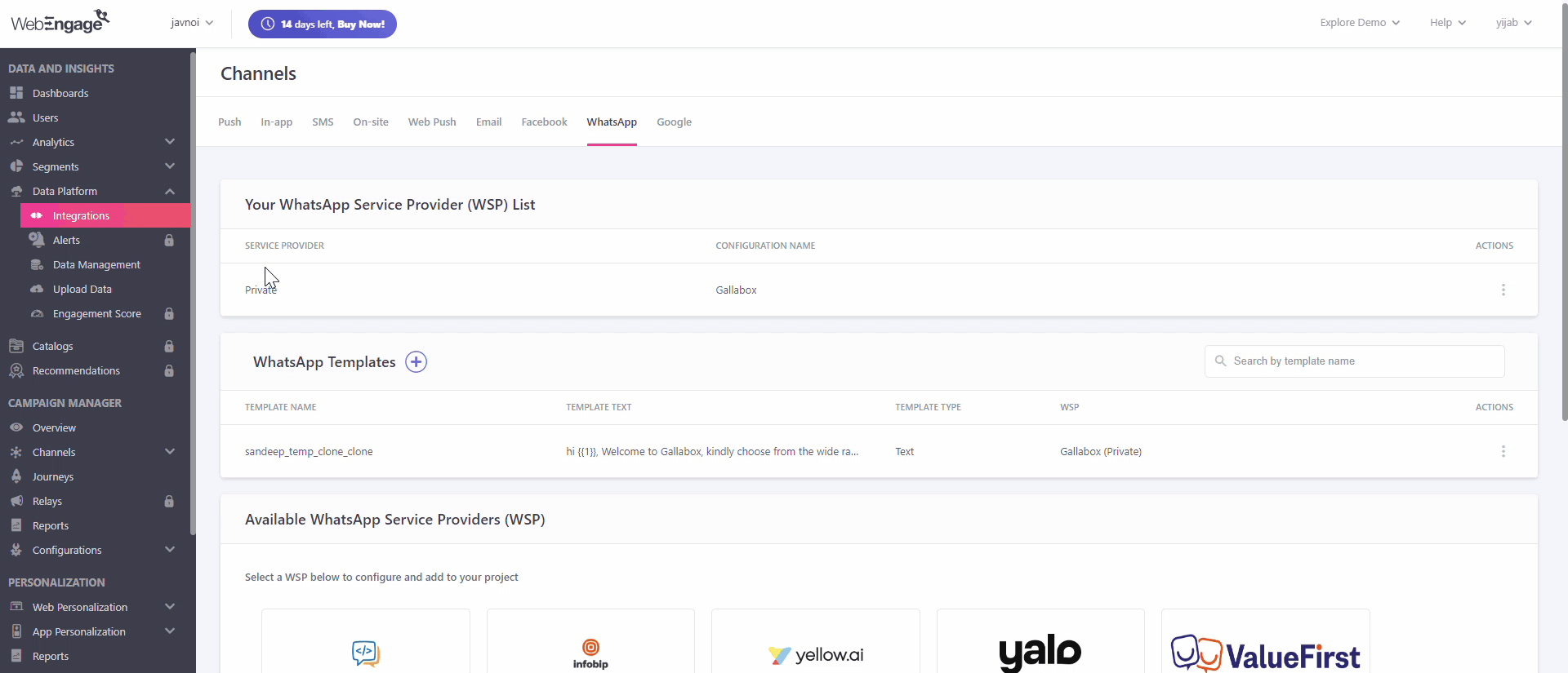 * [Campaign Type & Schedule](https://knowledgebase.webengage.com/docs/creating-whatsapp-campaigns#campaign-schedule)