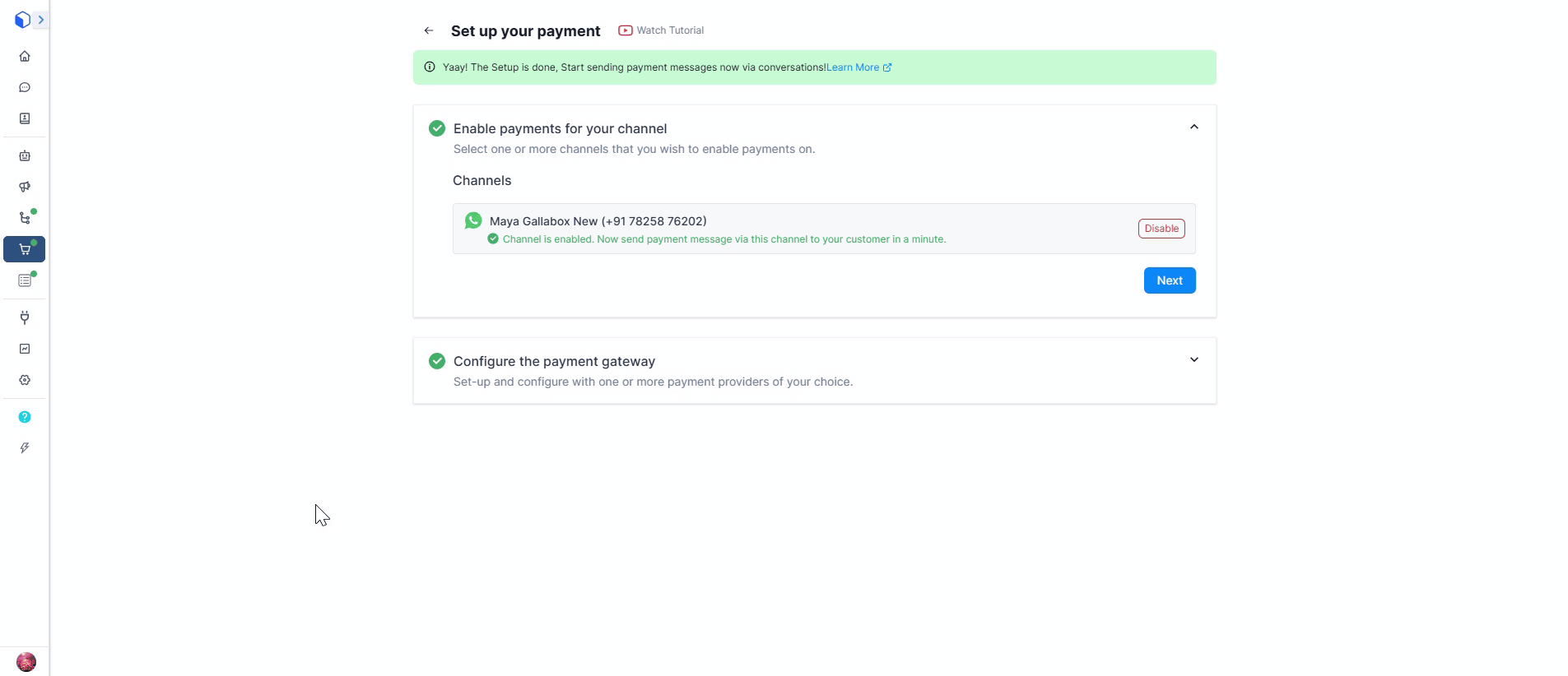2. Choose the WhatsApp Channel for which you will enable the paymnet gateway. If you have already added another payment gateway, check if it is enabled and click next.&#x20;