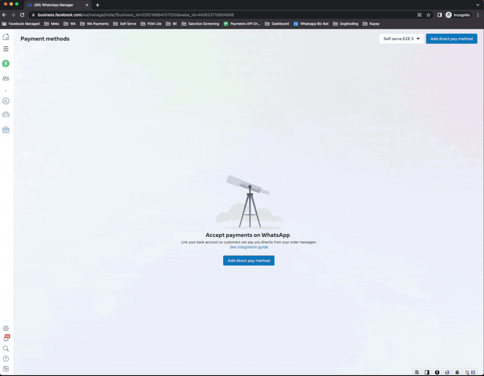 1. Navigate to the '***Direct pay methods***' page under the '***India***' section in WhatsApp Business Manager.