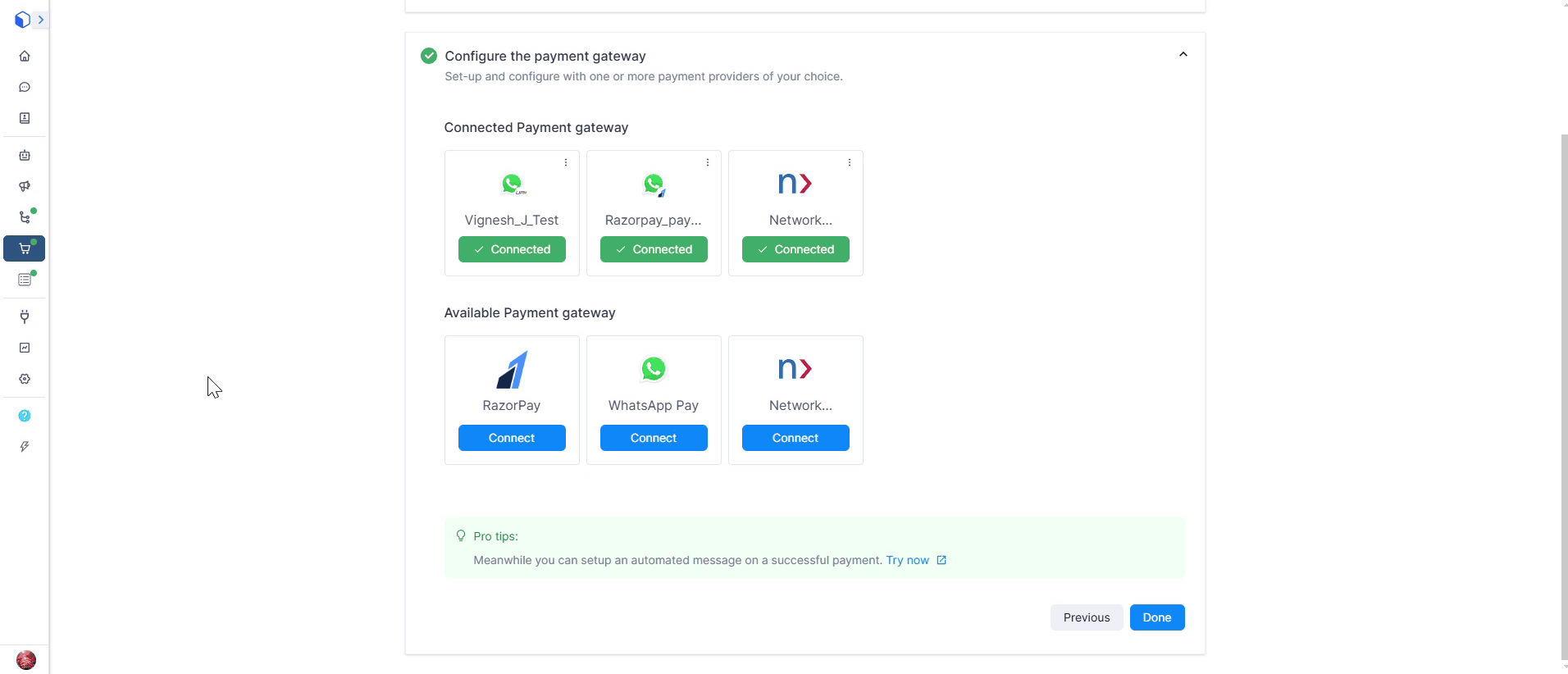 2. Click on **Done** and y*ou have successfully establish a connection for the payments.* You can now send payment links to your Customers and track the status of the payments.