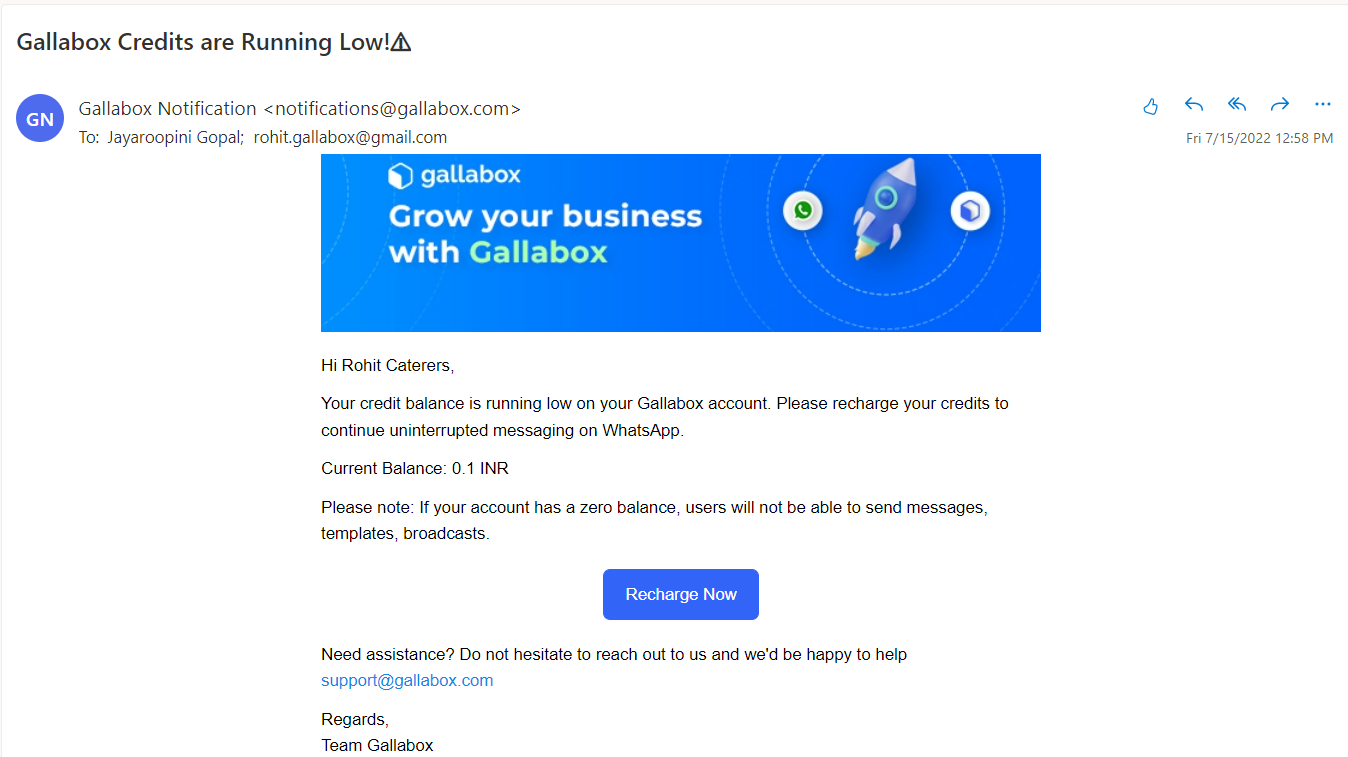 1. **Get notified** in your Gallabox account and by mail when your account balance is running low INR - INR `100` and `USD 5` respectively.