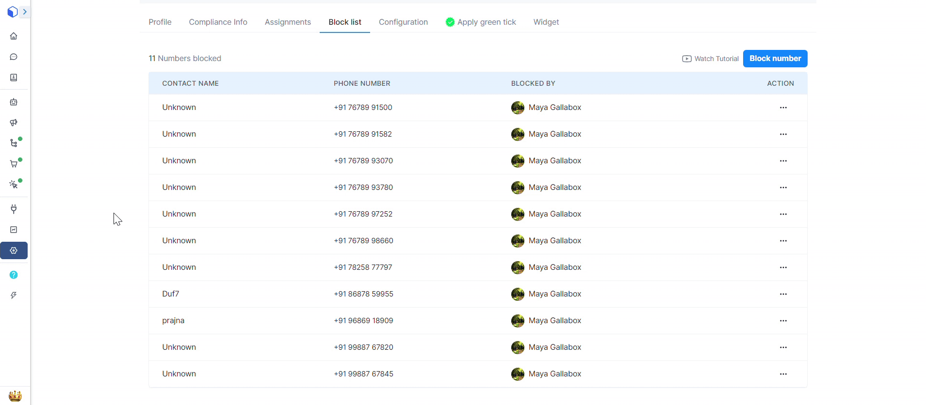 Should you ever change your mind or wish to unblock a number, Gallabox allows you to do so effortlessly. Navigate to your list of blocked numbers and unblock any contact with ease. Follow the below GIF to unblock a Contact.&#x20;