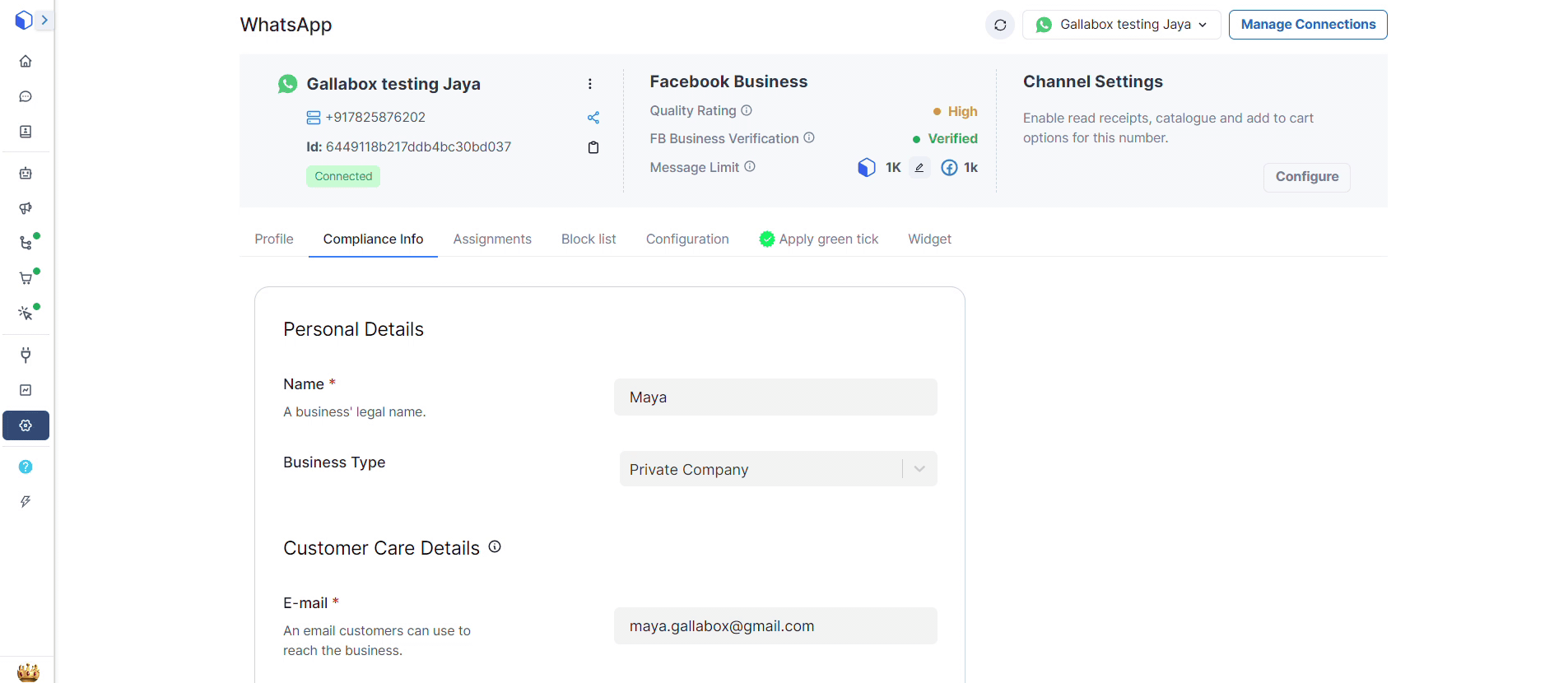 Compliance Info in WhatsApp Business API refers to the information related to handling customer complaints, feedback, and grievances effectively. It includes details such as contact information for customer care and a designated grievance officer.