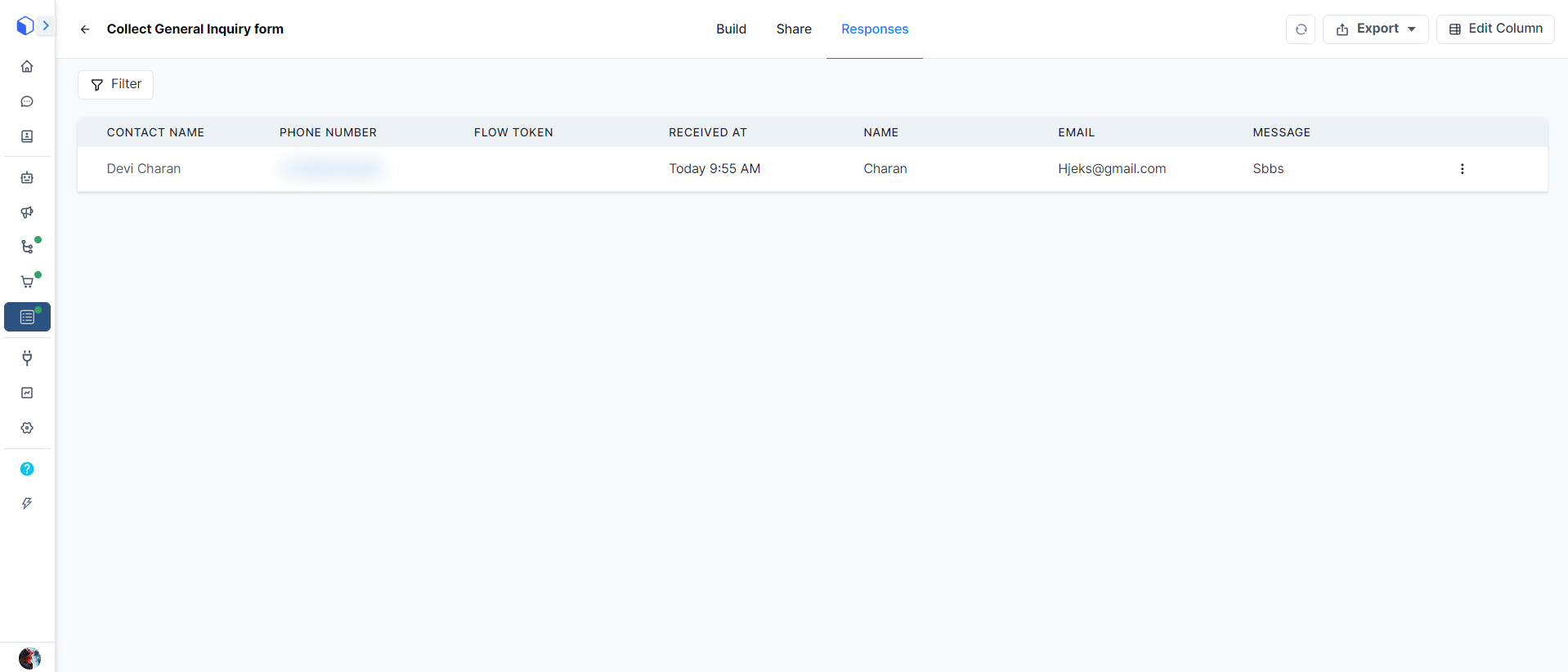 You can view the responses for all the customers interacting with your published WhatsApp Flow under the 'Responses' tab.&#x20;